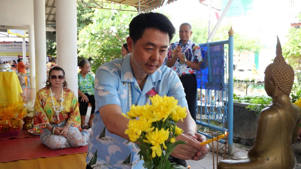 ในการนี้นายปรเมศวร์ งามพิเชษฐ์ นายกเมืองพัทยา เป็นตัวแทนจุดธูป-เทียน บูชาพระรัตนตรัย จากนั้นพระสงฆ์สวดให้ศีล ให้พร เสร็จสิ้น ชาวบ้านได้ถวายภัตตาหารเพล พร้อมรับประทานอาหารร่วมกัน