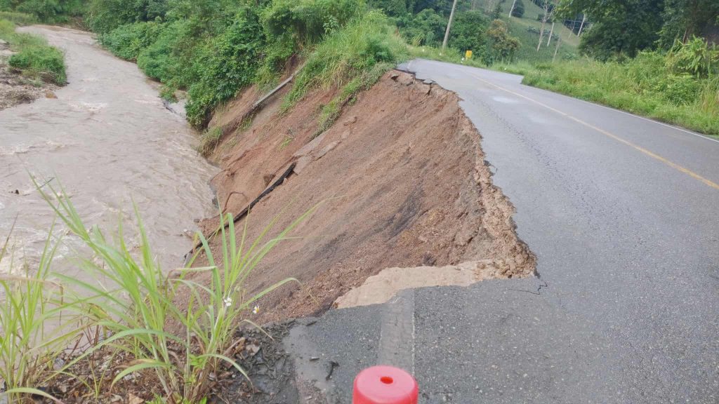 ได้กัดเซาะผิวถนน ทางหลวง 108 เข้ามาเกือบครึ่งเลน หมวดทางหลวงขุนยวม ได้ประกาศเตือนให้ผู้ที่สัญจรไปมาในพื้นที่ดังกล่าวให้ระมัดระวังในการสัญจร โดยช่วงสายวันนี้หมวดทางหลวงขุนยวม จะเร่งดำเนินการแก้ไขปัญหาที่เกิดขึ้นเป็นการเร่งด่วนแล้ว