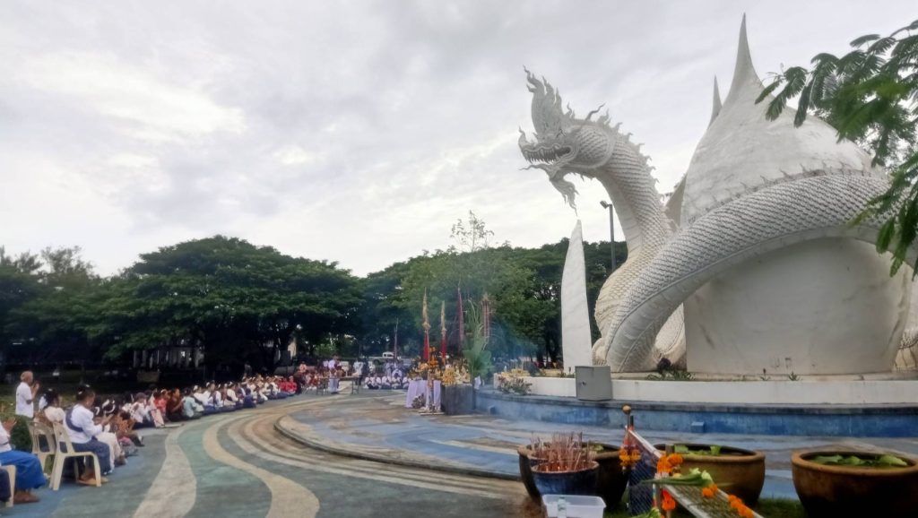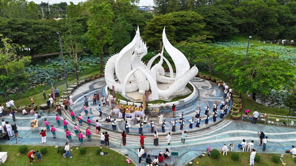 วันที่ 27 กันยายน 2568 ที่อุทยานบัวเฉลิมพระเกียรติ วิทยาเขตสกลนคร ได้จัดพิธีบวงสรวงพญานาคเผือก หรือองค์ปู่จักรรินทร์นาคราช สีขาวบริสุทธุิ์ ซึ่งตั้งตระหง่านอยู่ภานในอุทยานบัว โดยการร่วมกันระหว่างมหาวิทยาลัย พระสงฆ์และชาวบ้านร่วมกันจัดขึ้น ซึ่งนอกจากมีพิธีพราหมณ์แล้ว ยังมีนางรำแต่งกายด้วยชุดพื้นเมืองรำบวงสรวงเพื่อให้มีความเป็นสิริมงคลและบันดาลให้มีโชคอยู่ดย็นเป็นสุข ซึ่งองค์ปู่จักรรินทร์นาคราช ก่อสร้างขึ้นปี 2559 เสร็จเมื่อปี 2560 สูงกว่า 10 เมตร ลำตัวใหญ่ 3 คนโอบ มีเกล็ดสวยงาม ตั้งแต่เศียรจรดหาง 18 เมตร