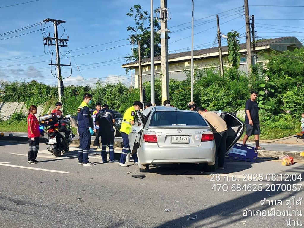 เมื่อวันที่ 28 กันยายน 2568 เวลา 07.55 น. ร.ต.อ.ชวลิต เทรักสี พนักงานสอบสวน สภ.เมืองน่าน ได้รับแจ้งจากศูนย์วิทยุ 191 ว่าเกิดอุบัติเหตุรถยนต์เก๋งชนเสาไฟฟ้าเกาะกลางถนน บริเวณหน้าจุดยูเทิร์นโรงเรียนบ้านธงน้อย ถนนน่าน–เวียงสา ตำบลดู่ใต้ อำเภอเมืองน่าน