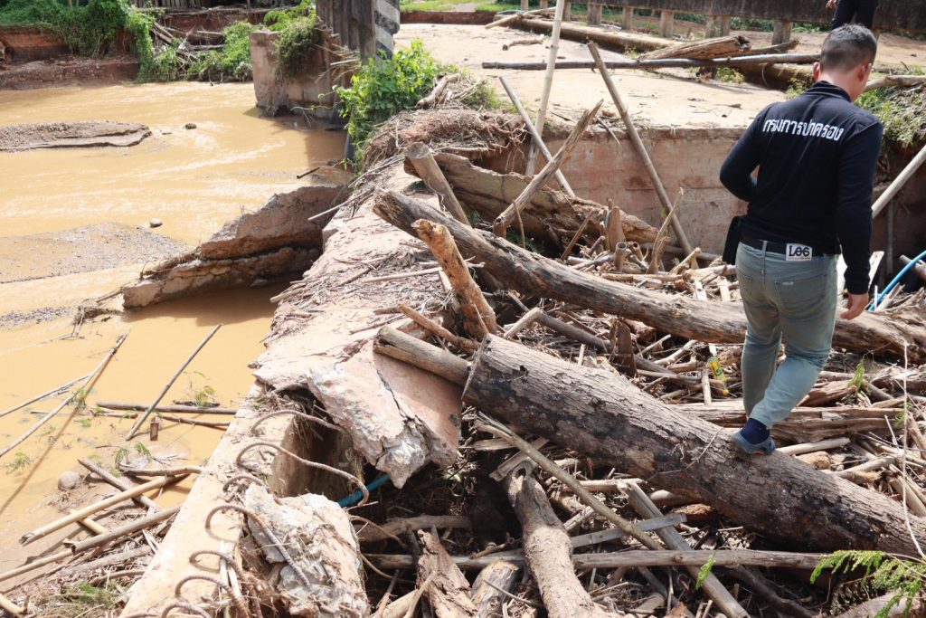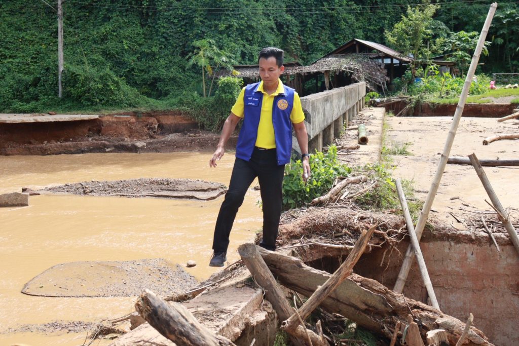 น้ำป่าที่ไหลบ่าเข้ามามีกำลังแรง กัดเซาะคอสะพานทางเข้าหย่อมบ้านจนขาด ทำให้เส้นทางสัญจรถูกตัดขาดไม่สามารถใช้งานได้ อีกทั้งกระแสน้ำยังพัดพาเอาดินโคลน ก้อนหิน และเศษซากกิ่งไม้จำนวนมากมากีดขวางทางน้ำ ส่งผลกระทบต่อการใช้ชีวิตประจำวันของประชาชนในพื้นที่อย่างหนัก หลายครอบครัวไม่สามารถเดินทางเข้าออกหมู่บ้านได้ สร้างความเดือดร้อนให้กับราษฎรจำนวนมาก