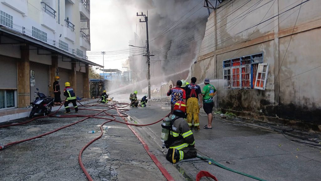 จึงแจ้งเจ้าหน้าที่ดับเพลิงเทศบาลนคระยอง นายกัฬชัย เทพวรชัย รอง ผวจ.นายวิชิต ศรีชลา นายกเทศมนตรีเทศบาลนครระยอง และ พตอ.อาทิตย์ ยาแก้ว ผกก.สภ.เมืองระยอง ไปที่เกิดเหตุ ระดมรถดับเพลิงนับ 10 คัน เข้าระงับเหตุ โดยที่เกิดเหตุพบต้นเพลิงอยู่บริเวณโกดังเก็บสินค้าหลังร้าน เก็บประเภทน้ำมันเครื่อง อุปกรณ์การเกษตร ปั๊มน้ำ เครื่องมือช่างซึ่งเป็นโกดังที่เชื่อมต่อจากด้านหน้าลึกเข้าไปด้านหลังโดยไฟได้ลุกไหม้โหมอย่างรุนแรง