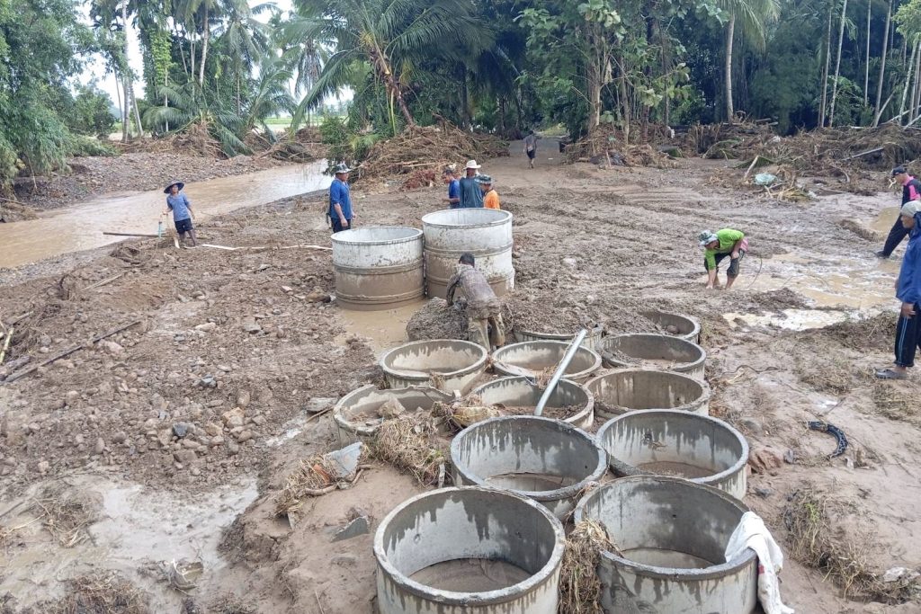 ขุดวางท่อเพื่อซ่อมแซมระบบประปาของหมู่บ้านที่ถูกน้ำป่านำดินโคลนไหลทะลักเข้าอุดตัน เพื่อให้ชาวบ้านมีน้ำประปาหมู่บ้านใช้ได้ตามปกติ พร้อมทั้งขุดตักดินโคลนเพื่อเปลี่ยนเส้นทางน้ำ