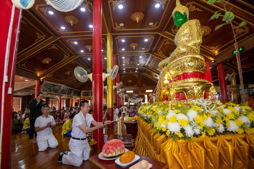พล.ต.ท.ณพวัฒน์ อารยางกูร และครอบครัว เจ้าภาพสร้างพระแก้วมรกต นำคณะศรัทธาใหญ่ในการถวายพระแก้วมรกต ประกอบด้วย คุณภูมิศักดิ์ อารยางค์กูร , คุณผ่องพักตร์ อารยางกูร ,คุณรัตนา ทัลวัลลิ์ , คุณรุ่งรัตน์ ทัลวัลลิ์ , และคุณอารียา อารยางค์กูร เดินทางมาประกอบพิธีถวายพระแก้วมรกต องค์ที่ 84 พร้อมถวายกลองใหญ่ ฆ้องใหญ่ และระฆังใหญ่ เพื่อนำประดิษฐานไว้