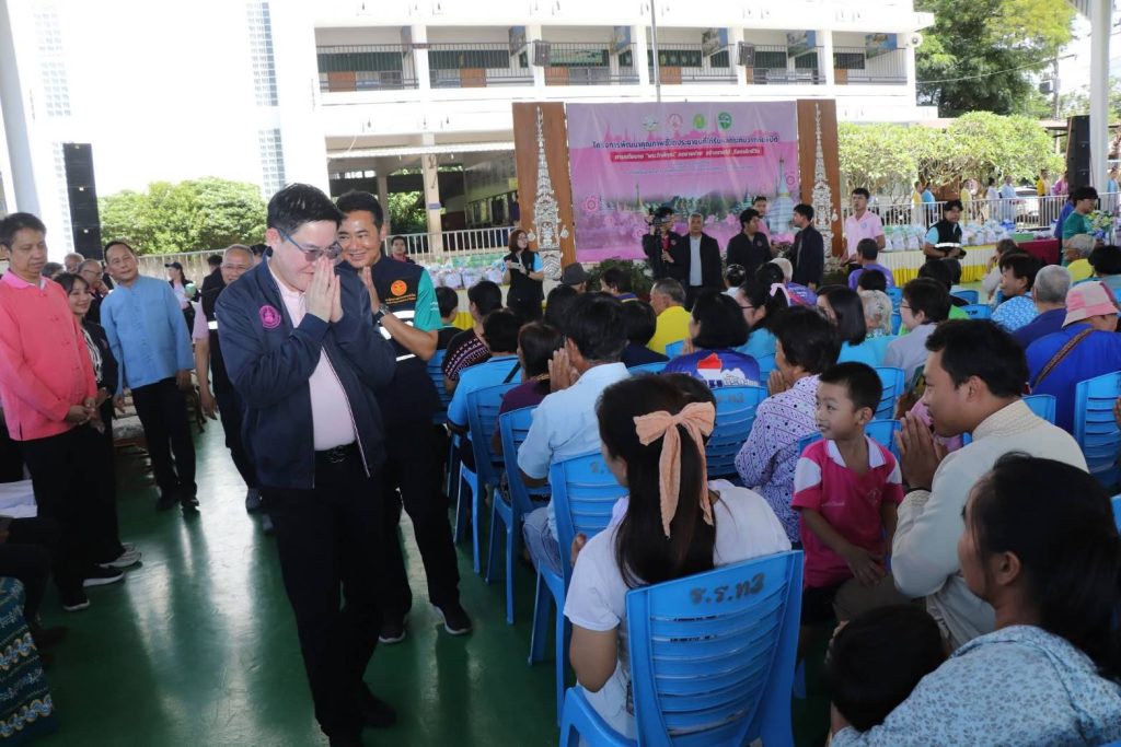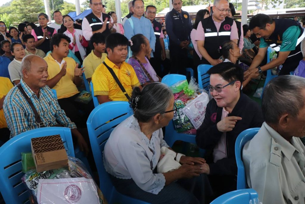 จากนั้นเดินทางไปยังโรงเรียนเทศบาล 3 ตำบลจองคำ อำเภอเมืองแม่ฮ่องสอน จังหวัดแม่ฮ่องสอน ส่งมอบสิ่งของบริจาคจากมูลนิธิธรรมนัส พรหมเผ่า ให้แก่ตัวแทนผู้ประสบภัยจากอำเภอแม่สะเรียง เงินสงเคราะห์ผู้ประสบปัญหาทางสังคม จำนวน 30 ครอบครัว เครื่องอุปโภคบริโภคให้กับกลุ่มเปราะบาง จำนวน 115 ชุด ชุดยาสามัญประจำบ้านแก่ประชาชนที่มาต้อนรับ จำนวน 515 ชุด และมอบป้ายงบประมาณโครงการบ้านมั่นคงชนบทภัยพิบัติ และการช่วยเหลือครัวเรือน ได้แก่ โครงการบ้านมั่นคงชนบทภัยพิบัติบ้านหัวแม่ลาก๊ะ อ.ขุนยวม จำนวน 39 ครัวเรือน โครงการบ้านมั่นคงชนบท ต.ท่าผาปุ้ม อ.แม่ลาน้อย จำนวน 80 ครัวเรือน โครงการบ้านมั่นคงชนบทตำบลเมืองปอน อ.ขุนยวม จำานวน 203 ครัวเรือน โครงการช่วยเหลือผู้ประสบภัยพิบัติภาคเหนือ (สนับสนุนช่วยเหลือเครื่องครัว) จำนวน 2 ตำบล โครงการพัฒนาเศรษฐกิจชุมชนภายใต้การพัฒนาที่อยู่อาศัยผู้มีรายได้น้อย และ การขับเคลื่อนชุมชน จำนวน ๕ ตำบล และเยี่ยมชมนิทรรศการ ของหน่วยงานราชการ สภาเด็กและเยาวชน องค์กรให้ความช่วยเหลือด้านสังคมสงเคราะห์ และกลุ่มคนพิการจังหวัดแม่ฮ่องสอน