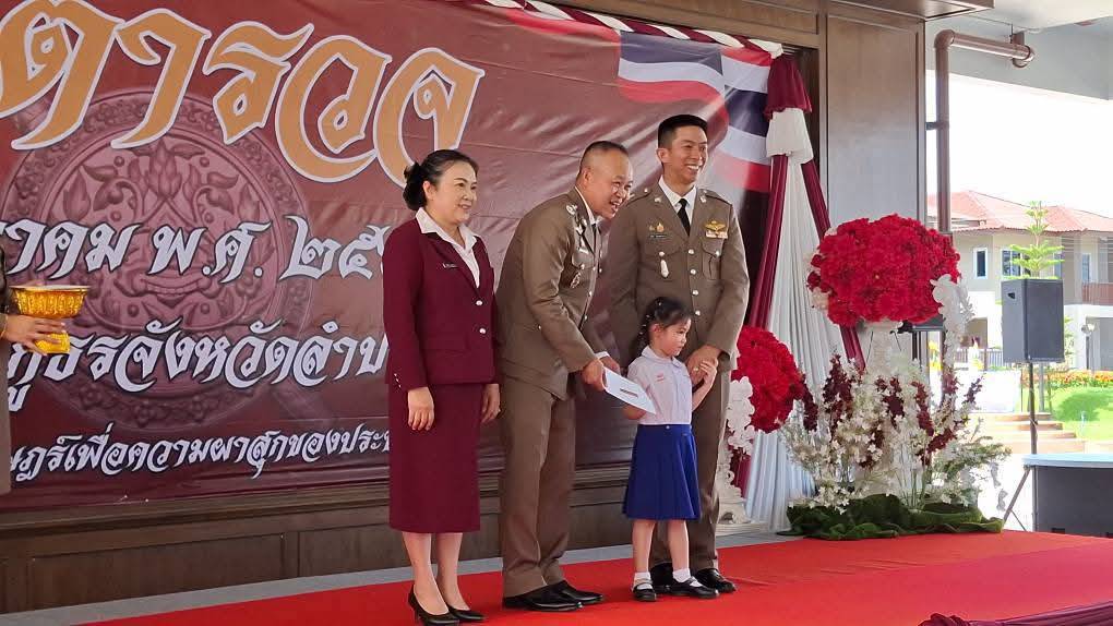 โดย ผบก.ภ.จว.ลำปาง อ่านสาร พล.ต.อ.กิตติ์รัฐ พันธุ์เพชร ผบ. ตร.เนื่องในวันตำรวจประจำปี 2568 และนำ กล่าวคำปฏิญาณตน พิธีมอบโล่และประกาศเกียรติคุณ ให้กับพลเมืองดีช่วยเหลืองานราชการตำรวจประจำปี 2568 จำนวน 2 ราย ได้แก่ นายณัฐพงษ์ แสงจันทร์ ชาว ต.เวียงหมอก อ.เถิน ที่บุตรชาย ได้ช่วยตำรวจ ในคดีจับกุมยาบ้า ตนเองจมน้ำเสียชีวิตและนายชวลิต ชาวลำปางช่วยแจ้งเบาะแสตำรวจจับคนร้ายเข้าไปขโมยสินค้าในร้านสะดวกซื้อเขตพื้นที่ สภ.เขลางค์นคร และพิธีมอบประกาศนียบัตรให้แก่แม่บ้านตำรวจ ภ.จว.ลำปาง รางวัล”แม่บ้านยุคใหม่ใส่ใจการเงิน.”