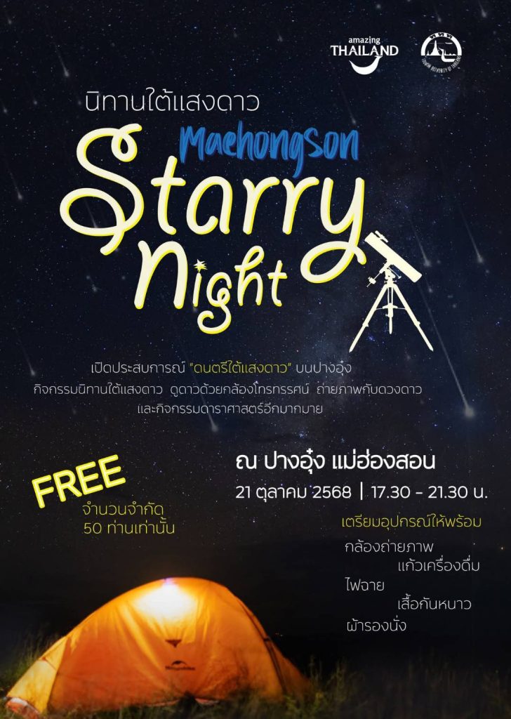 เมื่อวันที่ 21 ตุลาคม 2568 ที่บริเวณสันเขื่อนอ่างเก็บน้ำปางตอง โครงการพระราชดำริปางตอง 2 (ปางอุ๋ง) อำเภอเมืองแม่ฮ่องสอน จังหวัดแม่ฮ่องสอน นางสาวชุติพร เสชัง ผู้ว่าราชการจังหวัดแม่ฮ่องสอน พร้อมด้วยนายอุดมศักดิ์ ขาวหนูนา รองผู้ว่าราชการจังหวัดแม่ฮ่องสอน หัวหน้าส่วนราชการ สื่อมวลชน และนักท่องเที่ยว ร่วมกิจกรรม “นิทานใต้แสงดาว (Maehongson Starry Night)” จัดโดย ททท.สำนักงานแม่ฮ่องสอน ร่วมกับอุทยานแห่งชาติถ้ำปลา-น้ำตกผาเสื่อ เพื่อทดสอบตลาดการท่องเที่ยวเชิงดาราศาสตร์ในพื้นที่จังหวัดแม่ฮ่องสอน และประชาสัมพันธ์อ่างเก็บน้ำปางตอง หรือ ปางอุ๋ง ในเขตอุทยานแห่งชาติถ้ำปลา–น้ำตกผาเสื่อ ซึ่งเป็นเขตอนุรักษ์ท้องฟ้ามืดหนึ่งเดียวในจังหวัดแม่ฮ่องสอน จากทั้งสิ้น 64 แห่งทั่วประเทศ (ข้อมูลปี 2568 จาก NARIT)