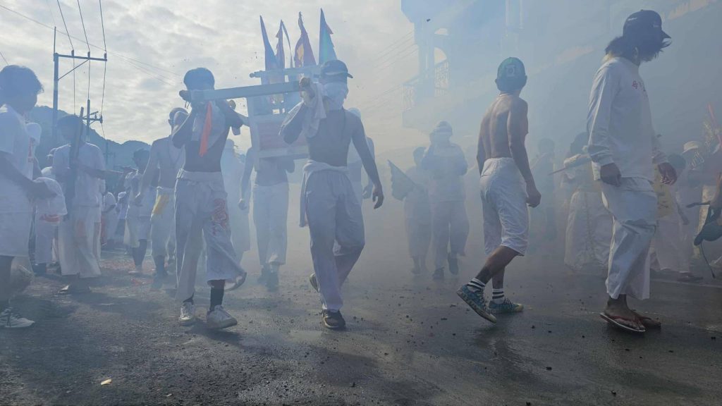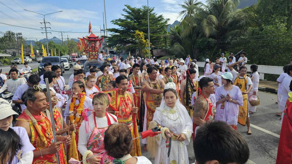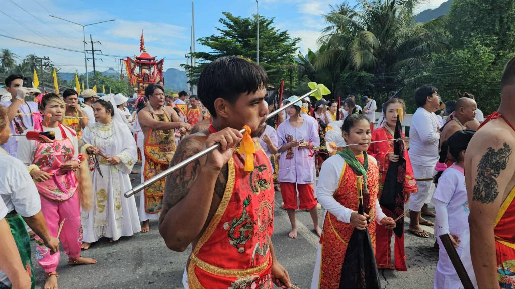 ทั้งผู้ชาย ผู้หญิงกว่า 500 องค์ ร่วมแสดงอิทธิฤทธิ์ด้วยการทรมานร่างกาย โดยการใช้อุปกรณ์นานาชนิด และหลากหลายรูปแบบ ซึ่งส่วนใหญ่เป็นของมีคมทิ่มแทงไปตามอวัยวะต่างๆ ของร่างกาย ซึ่งเชื่อว่าเป็นการรับเคราะห์แทนผู้ถือศีลกินผักตามความเชื่อมาแต่โบราณ โดยมีประชาชนเชื้อสายจีนที่มีภูมิลำเนาอยู่ในเขตอำเภอเมืองพังงา และพื้นที่ข้างเคียง รวมทั้งนักท่องเที่ยวได้ร่วมกันแต่งกายด้วยชุดขาวเข้าร่วมพิธีคอยติดตามขบวนแห่กว่า 5,000 คน และมีการตั้งโต๊ะที่บริเวณหน้าบ้าน พร้อมด้วย ธูป เทียน น้ำชา และบรรดาผลไม้นานาชนิดเพื่อรอรับขบวนพระผ่านหน้าบ้านเพื่อความเป็นสิริมงคลนำความโชคดีเข้ามาสู่บ้านเรือน โดยขบวนแห่พระได้แห่ไปรอบ ๆ เขตเทศบาลเมืองพังงา ไปสิ้นสุดพิธีที่ศาลเจ้าแม่ม่าจ้อโป๋