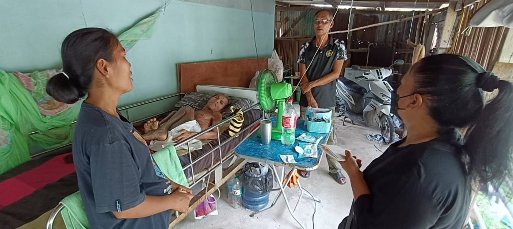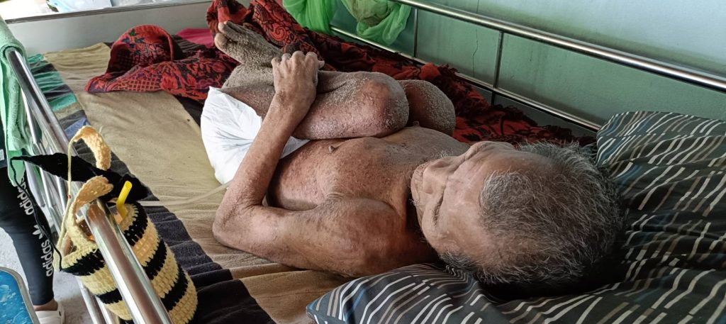 ซึ่งช่วงนั้นก็นำพ่อไปฝากที่ศูนย์ดูแลผู้สูงอายุ แต่เมื่อประมาณ ต้นปีที่ผ่านมาทางศูนย์ฯให้รับพ่อกลับมาดูแลที่บ้าน ซึ่งช่วงนั้นขาของพ่อก็ยังไม่ได้มีอาการงอ แต่อย่างใดยังสามารถที่จะยืดหดขาได้ แต่มีอาการเป็นสะเก็ดขึ้นที่ขาและเริ่มลอกออกมา ตนก็ทำได้แต่เพียงทาครีมให้เพราะคิดว่าผิวแห้ง แต่ต่อมาก็เริ่มลามขึ้นมาเรื่อยๆ จนตอนนี้มาขึ้นที่มือทั้งสองข้าง ซึ่งตนก็ไม่รู้ว่าเป็นโรคอะไรอยากจะพาพ่อไปรักษาก็ไม่มีเงิน ตอนนี้อาการของพ่อขาที่เคยเหยียดได้ก็เริ่มงอเข้ามาหาตัวไม่สามารถยืดออกได้