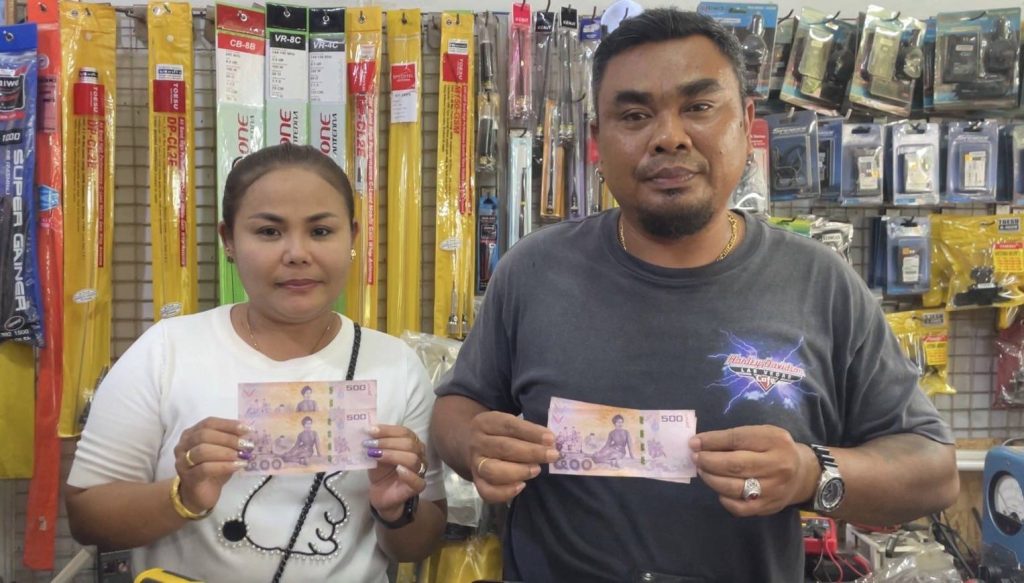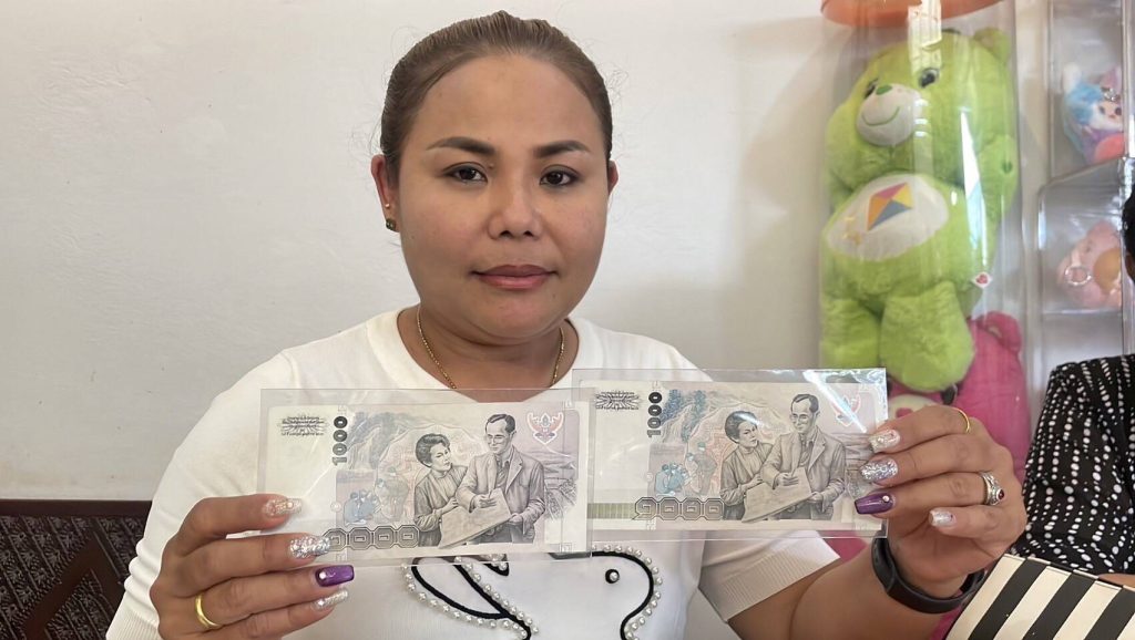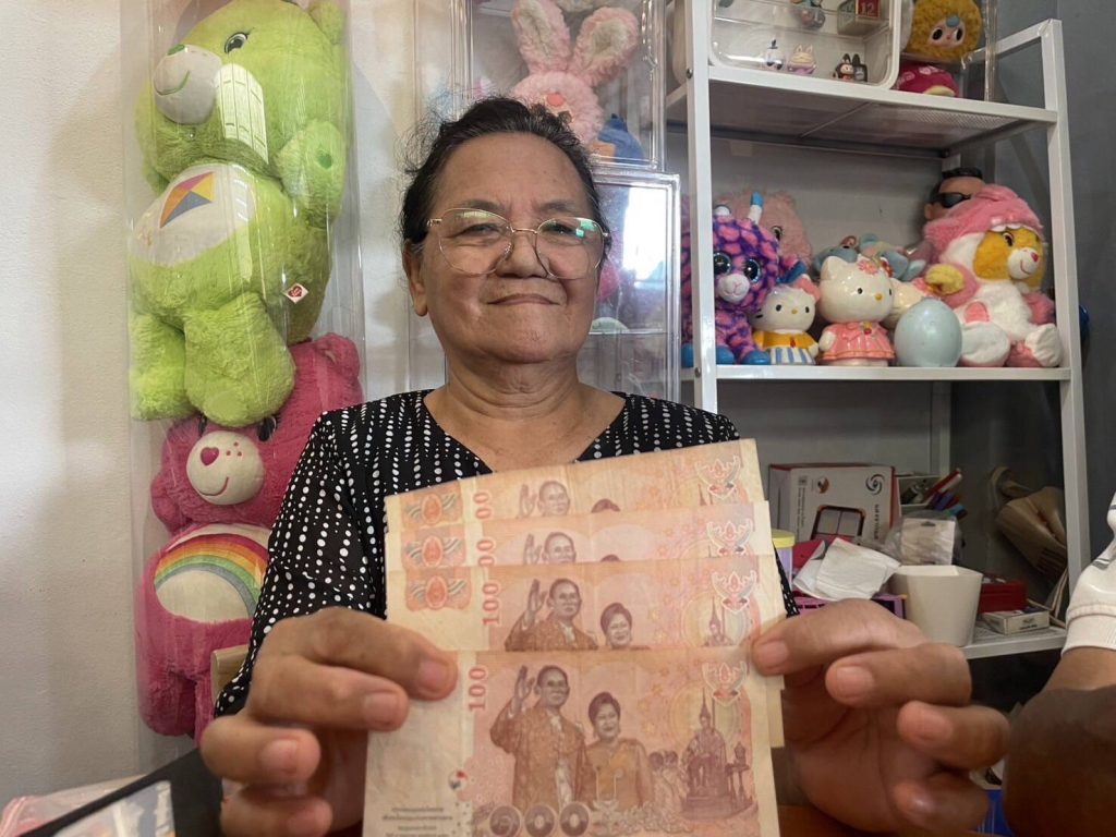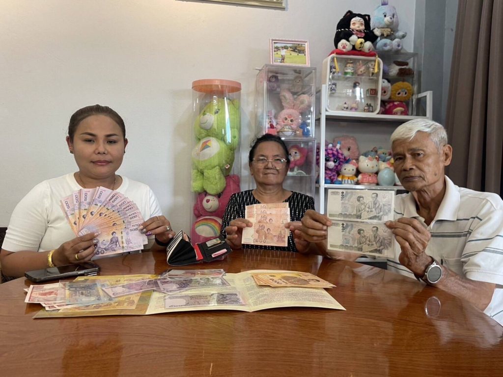 ธนบัตรฉบับละ 500 บาท ชนิดที่ด้านหน้า เป็นรูปในหลวงรัชกาลที่ 9 ส่วนด้านหลังเป็นรูปพระพันปีหลวงร่วม 30 ฉบับ เป็นของสะสมของ นางธิดารัตน์ มีศรี อายุ 47 ปี ชาวเมืองสุราษฎร์ธานี ถูกเก็บไว้เป็นอย่างดีไม่ถูกนำไปใช้ในชีวิตประจำวัน โดยใบแรกถูกเก็บมานานแล้วกว่า 13 ปี ในกระเป๋าเงินเป็นเงินขวัญถุงตามความเชื่อของคนไทย