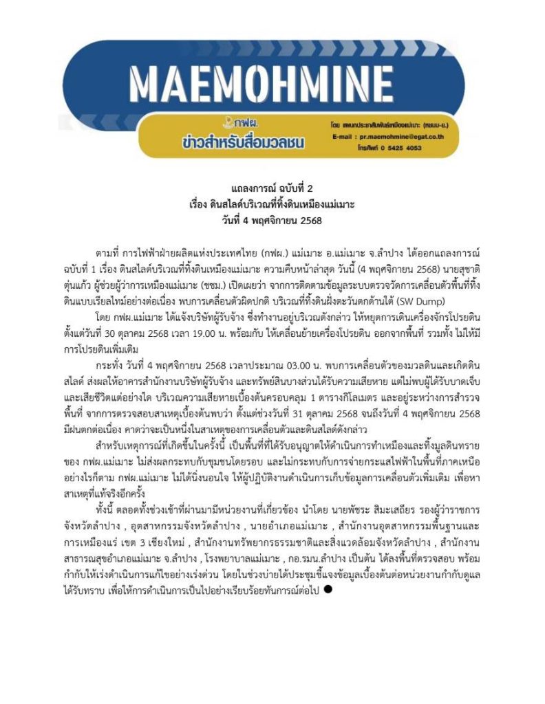 เมื่อวันที่ 4 พ.ย.2568 ที่ จ.ลำปาง ผู้สื่อข่าวรายงานว่า กฟผ.แม่เมาะ โดย แผนกประชาสัมพันธ์เหมืองแม่เมาะ รายงานแถลงการณ์ ฉบับที่ 2 เรื่อง ดินสไลด์บริเวณที่ทิ้งดินเหมืองแม่เมาะ ตามที่ การไฟฟ้าฝ้ายผลิตแห่งประเทศไทย (กฟผ.) แม่เมาะ อ.แม่เมาะ จ.ลำปาง ได้ออกแถลงการณ์ฉบับที่ 1 เรื่อง ดินสไลด์บริเวณที่ทิ้งดินเหมืองแม่เมาะ