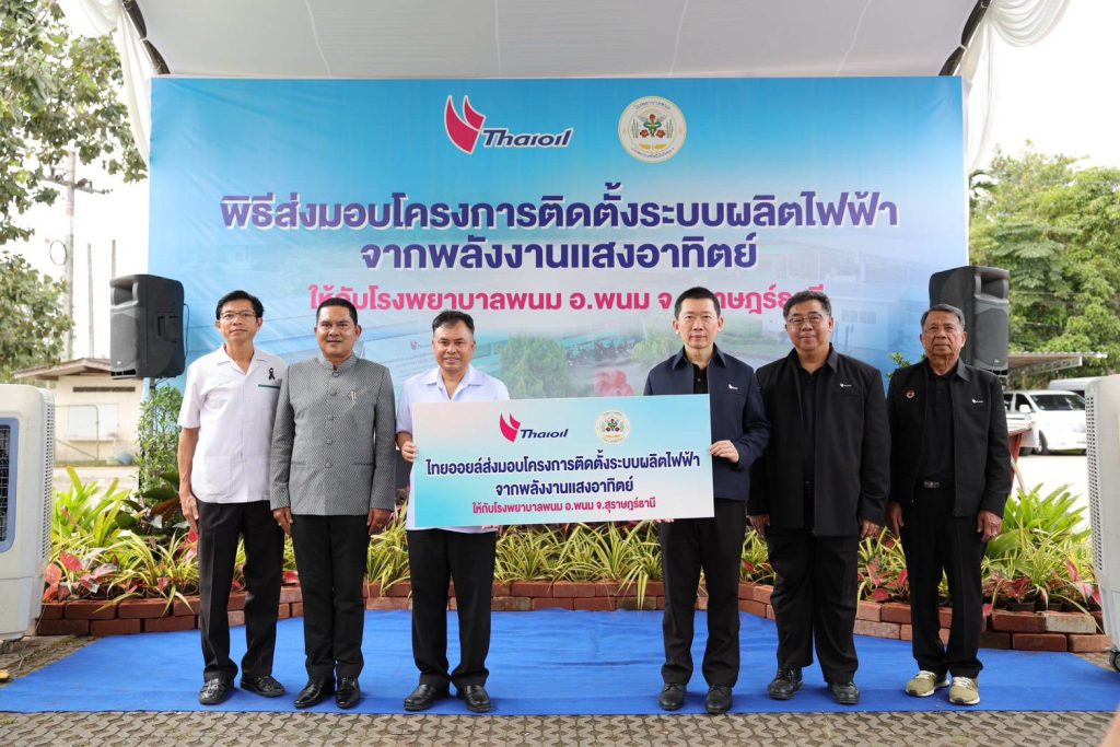 เจ้าหน้าที่โรงพยาบาลพนม พร้อมด้วยทีมสาธารณสุขจังหวัดสุราษฎร์ธานี ร่วมทำพิธีรับมอบโครงการติดตั้งระบบผลิตไฟฟ้าจากพลังงานแสงอาทิตย์ให้กับโรงพยาบาลพนม อ.พนม จ.สุราษฎร์ธานี ซึ่งเป็น โครงการติดตั้งระบบผลิตไฟฟ้าจากพลังงานแสงอาทิตย์ให้กับหน่วยงานสาธารณสุขและสถานศึกษาของภาครัฐ “Sustainable Energy for Healthcare & Education” ปี 2568 ของ บริษัท ไทยออยล์ จำกัด (มหาชน) เพื่อสร้างความมั่นคงด้านพลังงานไฟฟ้าในพื้นที่ห่างไกล ลดภาระค่าใช้จ่ายค่าไฟฟ้าของหน่วยงานสาธารณสุขและสถานศึกษา