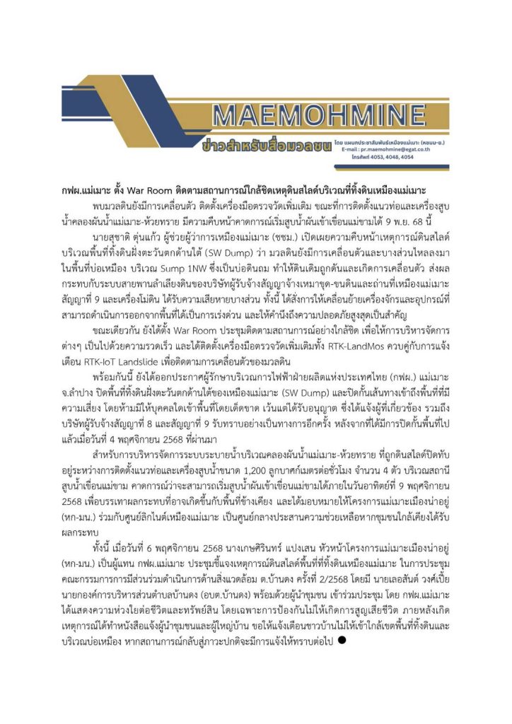 เมื่อวันที่ 7 พ.ย 2568 ที่ จ.ลำปาง ผู้สื่อข่าวรายงานว่า แผนกประชาสัมพันธ์เหมืองแม่เมาะ จ.ลำปาง แจ้งว่ากฟผ.แม่เมาะ ตั้ง War Room ติดตามสถานการณ์ใกล้ชิด เหตุดินสไลด์บริเวณที่ทิ้งดินเหมืองแม่เมาะ