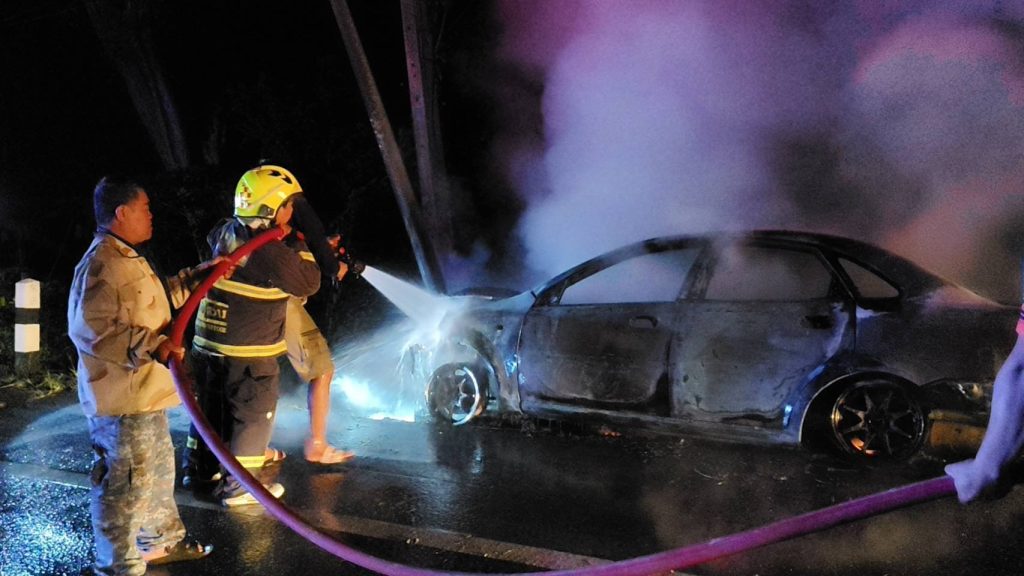 บุรีรัมย์ ฉลองรถใหม่ เมาไหลไปต่อ เสียหลักชนเสาไฟฟ้าไหม้วอดทั้งคัน