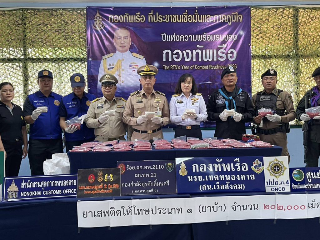วันที่ 9 พ.ย..68 ที่ สถานีเรือสังคม หน่วยเรือรักษาความสงบเรียบตามลำแม่น้ำโขง เขตหนองคาย อ.สังคม จ.หนองคาย น.อ.วิศิษฐ์พงศ์ เจริญวิชยเดช ผบ.นรข.เขตหนองคาย,นางสาววรรณา ผู้อุตส่าห์ นายด่านศุลกากรหนองคาย,นายนวน โทบุตร นอภ.สังคม, ร.อ.ไพรสน พลเสน หน.สน.เรืองสังคม นรข.เขตหนองคาย, ร.อ.ยุทธณา สีไชย์ ร้อย ฉก.ทพ.2110 ฉก.ทพ.21 และหน่วยงานความมั่นคงในพื้นที่ แถลงข่าวการตรวจยึดยาบ้าจำนวนกว่า202,000 เม็ด ได้ที่บริเวณริมฝั่งแม่น้ำโขงด้านหลังรีสอร์ทแห่งหนึ่งใน อ.สังคม
