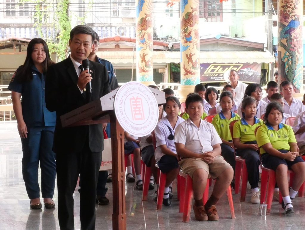 การมอบครั้งนี้เป็นการดำเนินงานโดยมูลนิธิป่อเต็กตึ๊ง ซึ่งได้รับความร่วมมือจาก มูลนิธิสว่างสระแก้วธรรมสถาน โดยมีคุณศิริพร กระจ่างหล้า ผู้จัดการฝ่ายสังคมสงเคราะห์มูลนิธิป่อเต็กตึ๊ง, คุณทรงศักดิ์ มหาสถิตย์ ประธานมูลนิธิสว่างสระแก้วธรรมสถาน, คุณสมเกียรติ คุณสาธรธรรม รองประธานมูลนิธิสว่างสระแก้ว พร้อมด้วยคณะกรรมการมูลนิธิฯ ผู้อำนวยการโรงเรียน ครูและนักเรียน เข้าร่วมพิธีและรับมอบ