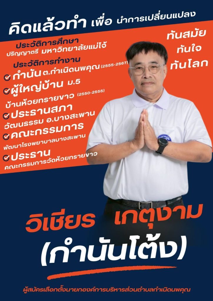 วันที่ 26 พฤศจิกายน 2568 ผู้สื่อข่าวรายงานว่าณ.ที่ตำบลกำเนิดนพคุณ – นายวิเชียร เกตุงาม หรือ “กำนันโต้ง” ประธานกลุ่ม รวมน้ำใจกำเนิดนพคุณ ประกาศความพร้อมลงสมัครรับเลือกตั้งเป็นนายกองค์การบริหารส่วนตำบลกำเนิดนพคุณ โดยมีนายประสงค์ สมทรง (นายกแป๊ะ) และทีมงานบริหารคุณภาพร่วมสนับสนุนอย่างแข็งขัน พร้อมให้คำมั่นจะเดินหน้าพัฒนาตำบลในทุกด้าน เพื่อให้ประชาชนมีคุณภาพชีวิตที่ดีขึ้นอย่างเป็นรูปธรรม