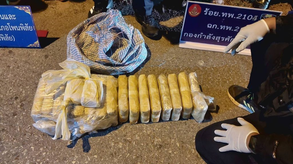 วันที่ 26 พ.ย. 68 ผู้สื่อข่าวรายงานว่า เมื่อวันที่ 25 พ.ย.68 ร้อย.ฉก.ทพ.2104 ฉก.ทพ.21ได้รับการแจ้งจาก ชุดปฏิบัติการข่าวที่ 3 กกล.สุรศักดิ์มนตรี และได้รับแจ้งจากสายลับว่าจะมีการลักลอบนำยาเสพติดจากประเทศเพื่อนบ้านข้ามที่บริเวณบ้านแดนเมือง ต.วัดหลวง อ.โพนพิสัยฯ ซึ่งข่าวสารตรงกัน พ.ต.วิทยา สิงห์อร ผบ.ร้อย.ฉก.ทพ.2104 ฉก.ทพ.21 จึงได้รายงานให้ พ.อ.ศรณณัฐ นวนมณี ผบ.ฉก.ทพ.21ทราบ จากนั้นได้บูรณาการร่วมกับ ตร.ชุดสืบสวนโพนพิสัย และหน่วยงานที่เกี่ยวข้อง เข้าดักซุ่มพื้นที่ดังกล่าว และบริเวณริมถนน ภายใต้การอำนวยการของ พล.ต.มงคล หอทอง ผบ.กกล.สุรศักดิ์มนตรี,พ.อ.เรวัฒ ธรรมจิรเดช เสธ.กกล.สุรศักดิ์มนตรี,พ.อ.ศรณณัฐ นวนมณี ผบ.ฉก.ทพ.21,พ.อ.อุดมการณ์ ศรีแขไตร รอง ผบ.ควบคุมที่ 2 กกล.สุรศักดิ์มตรี