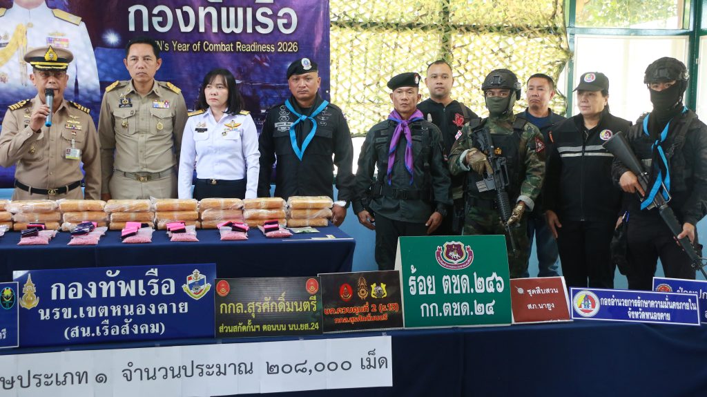 เมื่อวันที่ 27 พ.ย.68 ที่สถานีเรือสังคม นรข.เขตหนองคาย ต.สังคม อ.สังคม จ.หนองคาย , นายไพฑูรย์ มหาชื่นใจ รอง ผวจ.หนองคาย พร้อมด้วย น.อ.วิศิษฐ์พงศ์ เจริญวิชยเดช ผบ.นรข.เขตหนองคาย , นายนวน โทบุตร นายอำเภอสังคม , ร.อ.ไพรสน พลเสน หัวหน้าสถานีเรือสังคม (นรข.เขตหนองคาย) , ร.อ.ยุทธณา สีไชย์ ผู้บังคับกองร้อยเฉพาะกิจทหารพรานที่ 2110 หน่วยเฉพาะกิจทหารพรานที่ 21 , น.ส.วรรณา ผู้อุตส่าห์ นายด่านศุลกากรหนองคาย,ตำรวจภูธรอำเภอสังคม ,ตชด.246 ,และหน่วยงานความมั่นคงในพื้นที่ร่วมกันแถลงข่าวผลการจับกุม นายวีระพล (สงวนนามสกุล) อายุ 27 ปี ชาว ต.นางัว อ.น้ำโสม จ.อุดรธานี พร้อมของกลางยาบ้า จำนวน 208,000 เม็ด .