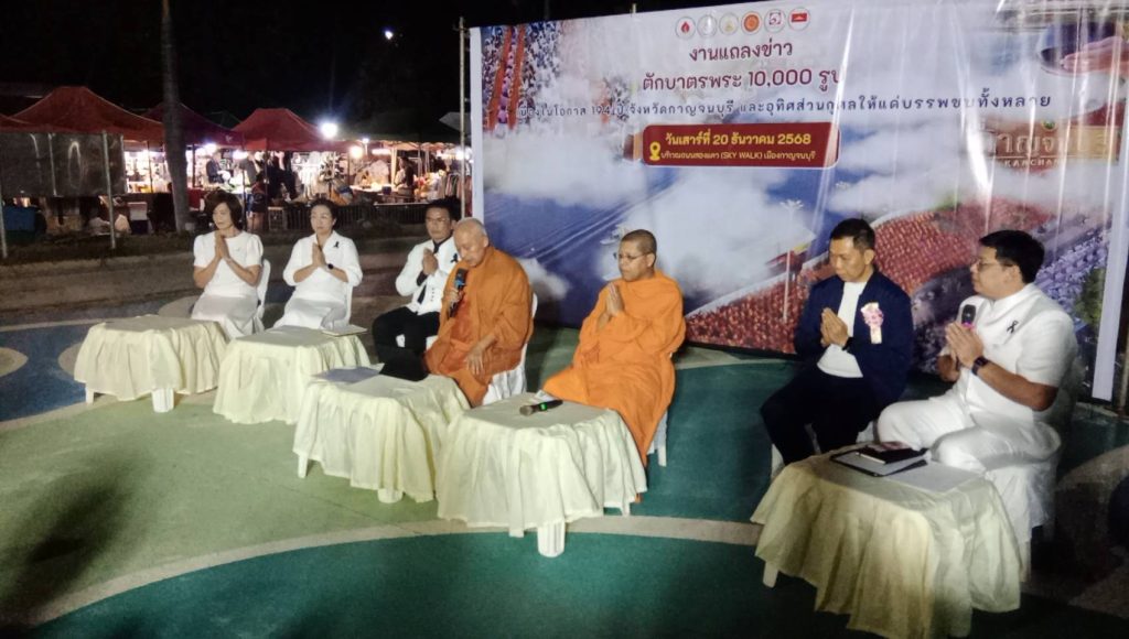 วันที่ 29 พฤศจิกายน 2568 ที่ลานกิจกรรม Sky Walk โซนปลายสักทอง จังหวัดกาญจนบุรี ได้มีการจัดงานแถลงข่าวเตรียมความพร้อมพิธีตักบาตรพระ 10,000 รูป ซึ่งจัดขึ้นเนื่องในโอกาสทำบุญเมืองครบรอบ 194 ปีจังหวัดกาญจนบุรี และเพื่ออุทิศถวายเป็นพระราชกุศลแด่สมเด็จพระนางเจ้าสิริกิติ์พระบรมราชินีนาถพระบรมราชชนนีพันปีหลวง