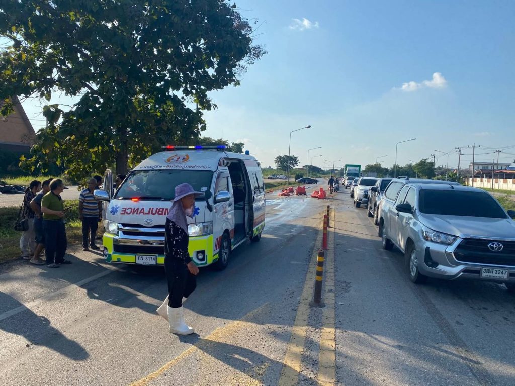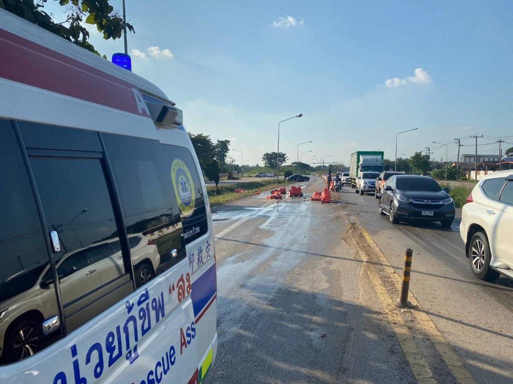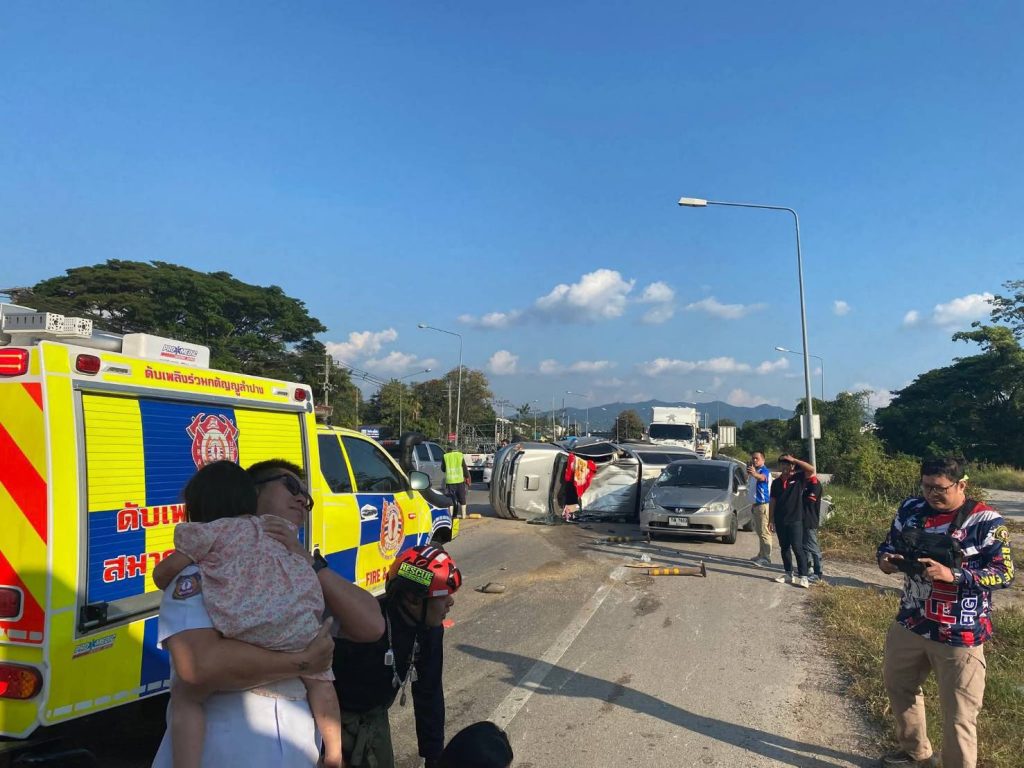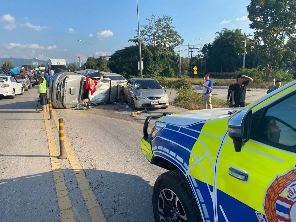 ลำปาง-อุบัติเหตุรถยนต์กระบะแซงรถบรรทุกขึ้นสะพานไม่พ้นเสียหลักลื่นไถลชนรถที่สวนทางมา บาดเจ็บ 6