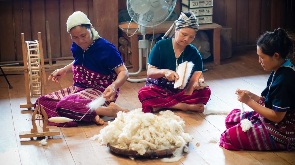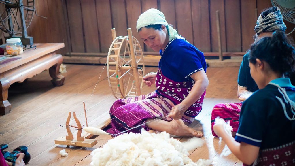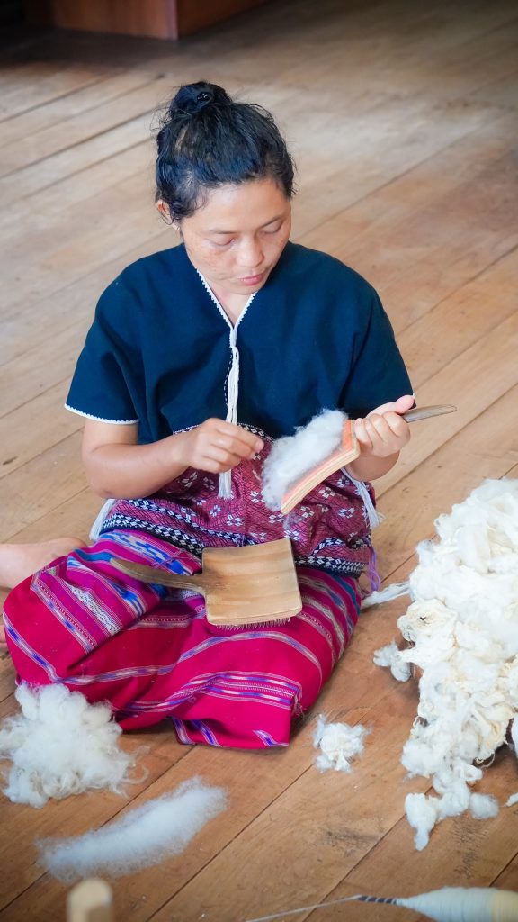 หลังจากที่ได้ขนแกะมาแล้ว ขั้นตอนต่อไปคือ การนำขนแกะไปแช่กับผงซักฟอก แล้วล้างทำความสะอาด แล้วนำไปต้มกับน้ำเดือดเพื่อให้ไขมันที่ติดขนแกะออก จากนั้นนำไปผึ่งแดดให้แห้ง แล้วนำขนแกะที่แห้งมาสางยีด้วยหวีที่นำเข้ามาจากนิวซีแลนด์ ให้เป็นขนปุยนุ่มเหมือนสำลี ต่อจากนั้นนำไปทำเป็นเส้นด้ายขนแกะ พร้อมที่จะเอาเส้นด้ายไปทอ ซึ่งคุณสมบัติของขนแกะที่ได้มีคุณภาพดี 100% นอกจากการทอด้ายขนแกะแล้ว ยังมีการนำด้ายขนแกะมาทอผสมผสานกับฝ้ายท้องถิ่นที่ย้อมด้วยสีธรรมชาติ โดยผ่านกระบวนการทอแบบโบราณ ด้วยการใช้ด้ายผูกกับไม้และผูกกับเอว หรือที่เรียกว่า กี่เอว จึงทำให้ผ้าทอที่ได้มีความนุ่ม มีลวดลายสวยงาม