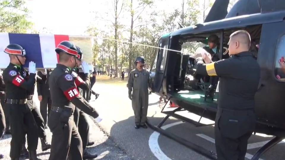 1 รูปพิจารณาทอดผ้าบังสุกุล ขบวนศพเคลื่อนศพลงจากอาคารสุริยะบูรพา ร.2 รอ. ไปขึ้นเฮลิคอปเตอร์ โดยมีกองทหารเกียรติยศ 1 หมวด ถือปืนเล็กล้วน มีแตรเดี่ยว ตั้งแถวหน้าอาคารสุริยะบูรพา ร.2 รอ.ได้ แสดงความเคารพ “วันทยาวุธ” พลแตรเป่าแตรเคารพ และได้เคลื่อนขบวนศพไปขึ้น ฮ. นำศพไปยังสนาม ฮ. โรงเรียนละหานเจริญวิทยา จ. ชัยภูมิขอคารวะต่อดวงวิญญาณของวีรชนผู้กล้า และจักรตราความทรงจำ ในความเสียสละที่ยิ่งใหญ่ ของท่านไว้ตลอดไป //////////ณัฐวัฒน์ กุลเศรษฐ์สุวภา ผู้สื่อข่าว จ.ปราจีนบุรี