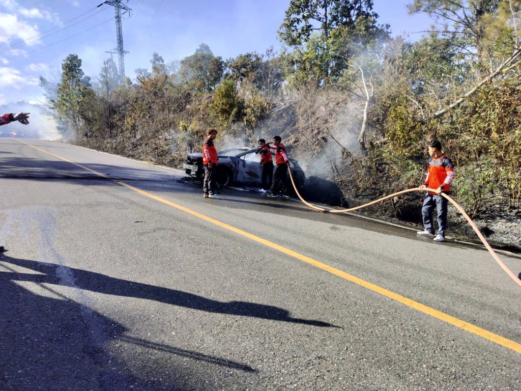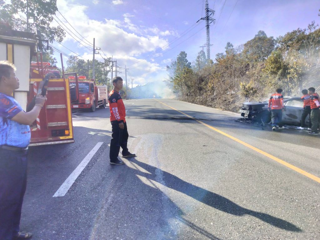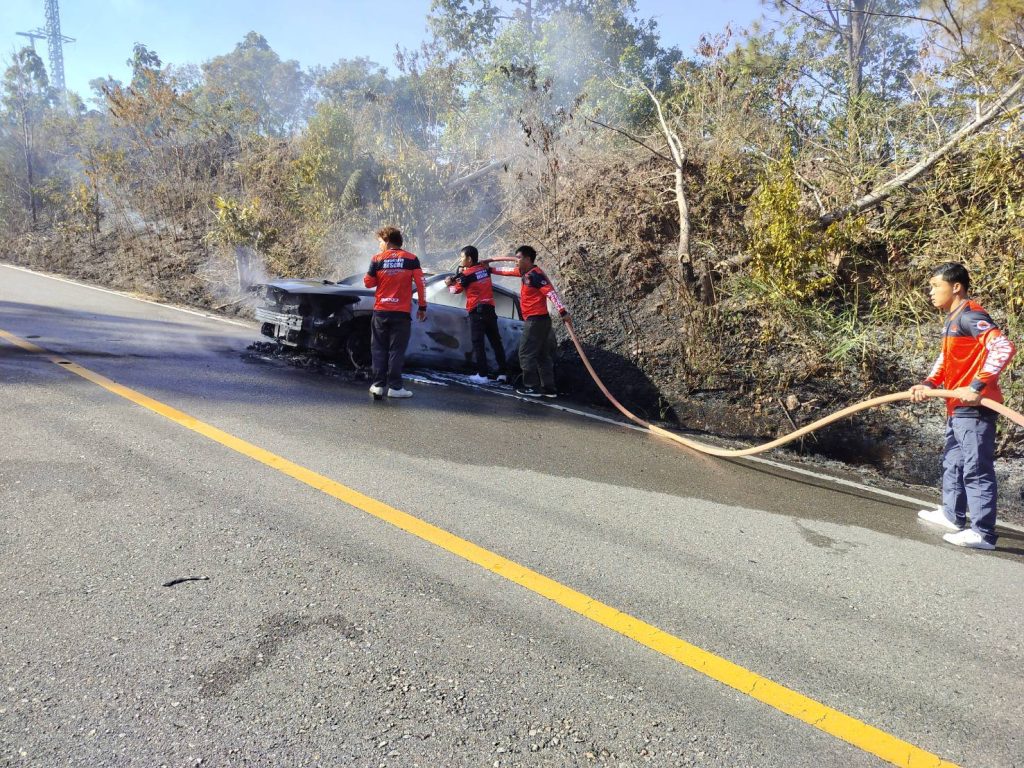 เมื่อไปถึงที่เกิดเหตุช่วงระหว่างบ้านน้ำกัด – บ้านห้วยสลอบ ต.ห้วยผา อ.เมืองแม่ฮ่องสอน ห่างจากตัวเมืองแม่ฮ่องสอนประมาณ 30 กม. พบเจ้าหน้าที่หน่วยดับเพลิง อบต.นาปู่ป้อม และ อบต.ห้วยผา กำลังช่วยกันดับไฟที่กำลังโหมไหม้รถยนต์เก๋งท่วมทั้งคันขณะตกอยู่ไหล่ทาง โดยมีนักท่องเที่ยวซึ่งเป็นชาวสเปนพ่อแม่ลูกรวม 4 คนยืนตกตลึงกับเหตุการณ์ระทึกไฟไหม้รถท่วมทั้งคัน