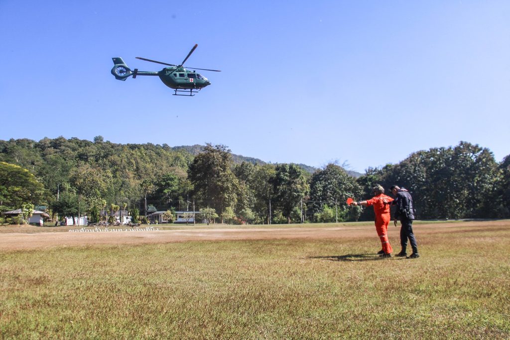 Sky doctor จากกองกำลังผาเมือง เชียงใหม่ บินมารับคนเจ็บจากอำเภอแม่สะเรียง จ.แม่ฮ่องสอนส่งด่วนไปรักษาที่เชียงใหม่ สาเหตุมาจากอุบัติหตุรถตกเหวได้รับบาดเจ็บสาหัส