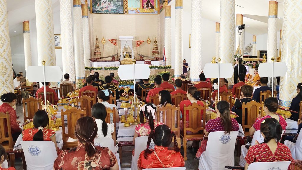 ซึ่งผู้ที่มาร่วมพิธีจะแต่งชุดไทยพื้นถิ่นกับชุดไทยย้อนยุค และมีกลุ่มชาติพันธุ์มาร่วมพิธี ประกอบด้วย ชาวไทยพื้นถิ่น-ชาวไทยเชื้อสายจีน-ลาวครั่ง-ไทยพวน-ไทยมอญ-กะเหรี่ยง-ไทยทรงดำ ทั้งเด็ก ผู้ใหญ่ จะถือดาบมาร่วมขบวนแห่กันอย่างคึกคัก โดยได้อัญเชิญดาบขึ้นแท่นบนเวที พระสงฆ์สวดเจริญพระพุทธมนต์ ประกอบพิธี เจิมและ ผูกผ้าแพรที่ดาบใหญ่มหามงคล