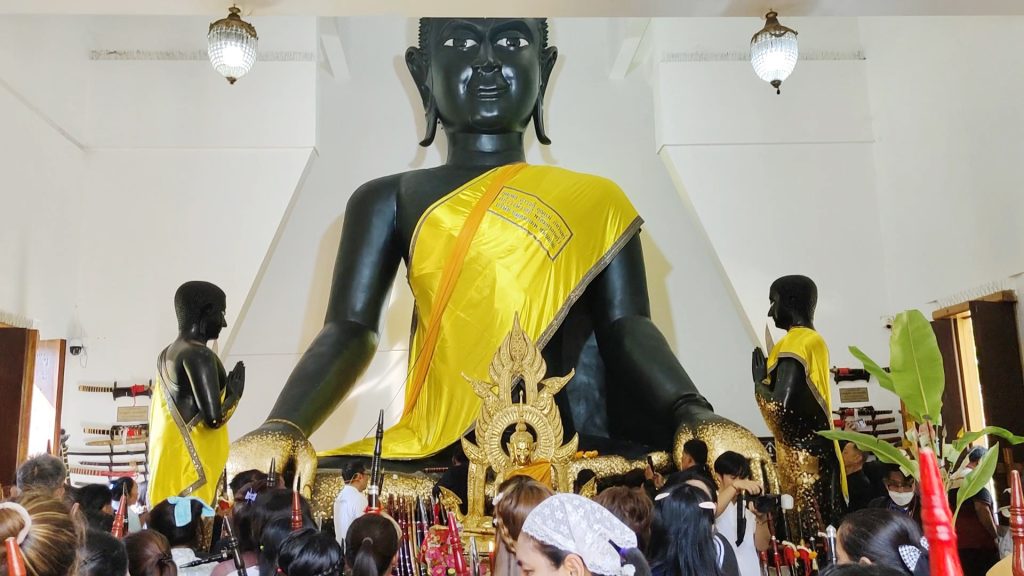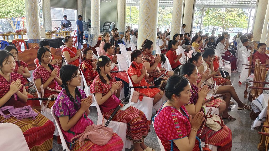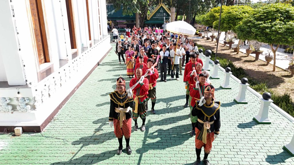 ซึ่งผู้ที่มาร่วมพิธีจะแต่งชุดไทยพื้นถิ่นกับชุดไทยย้อนยุค และมีกลุ่มชาติพันธุ์มาร่วมพิธี ประกอบด้วย ชาวไทยพื้นถิ่น-ชาวไทยเชื้อสายจีน-ลาวครั่ง-ไทยพวน-ไทยมอญ-กะเหรี่ยง-ไทยทรงดำ ทั้งเด็ก ผู้ใหญ่ จะถือดาบมาร่วมขบวนแห่กันอย่างคึกคัก โดยได้อัญเชิญดาบขึ้นแท่นบนเวที พระสงฆ์สวดเจริญพระพุทธมนต์ ประกอบพิธี เจิมและ ผูกผ้าแพรที่ดาบใหญ่มหามงคล