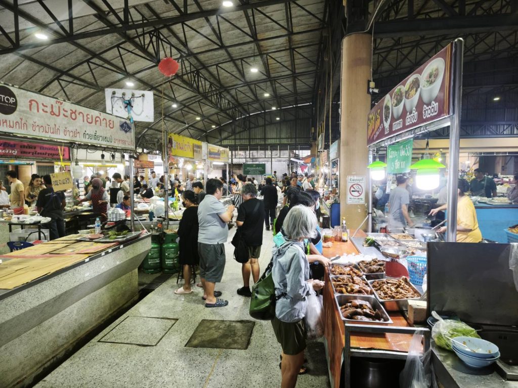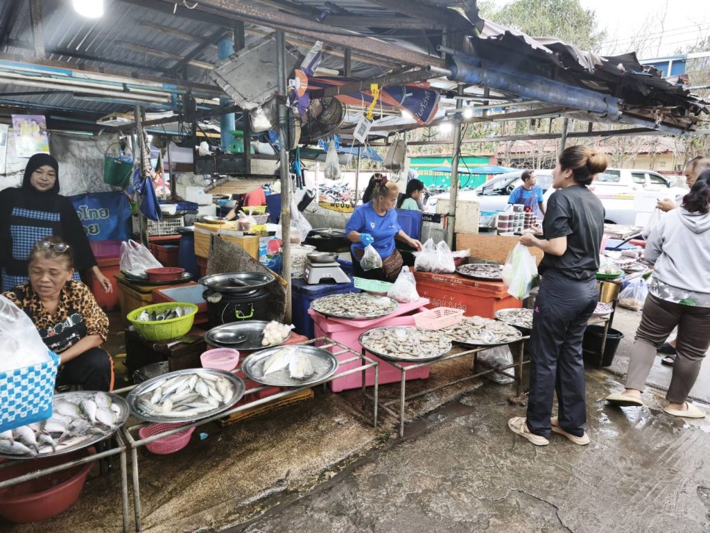 พ่อค้าแม่ค้าภายในตลาดต่างนำอาหารทะเลสดๆ อาทิ กุ้ง หอย ปู ปลา เนื้อสัตว์ รวมถึงผักและผลไม้สดหลากหลายชนิดมาวางจำหน่ายอย่างคึกคัก เพื่อตอบสนองความต้องการของประชาชนที่เตรียมนำไปประกอบอาหารฉลองคืนเคาท์ดาวน์และรับประทานร่วมกับครอบครัวที่บ้าน