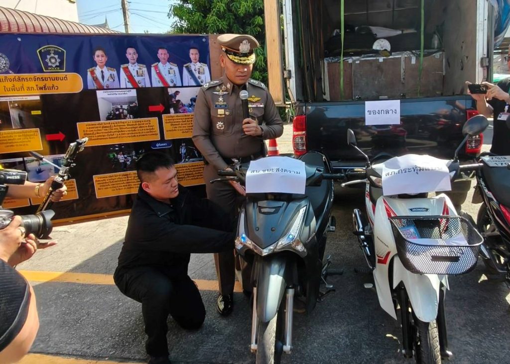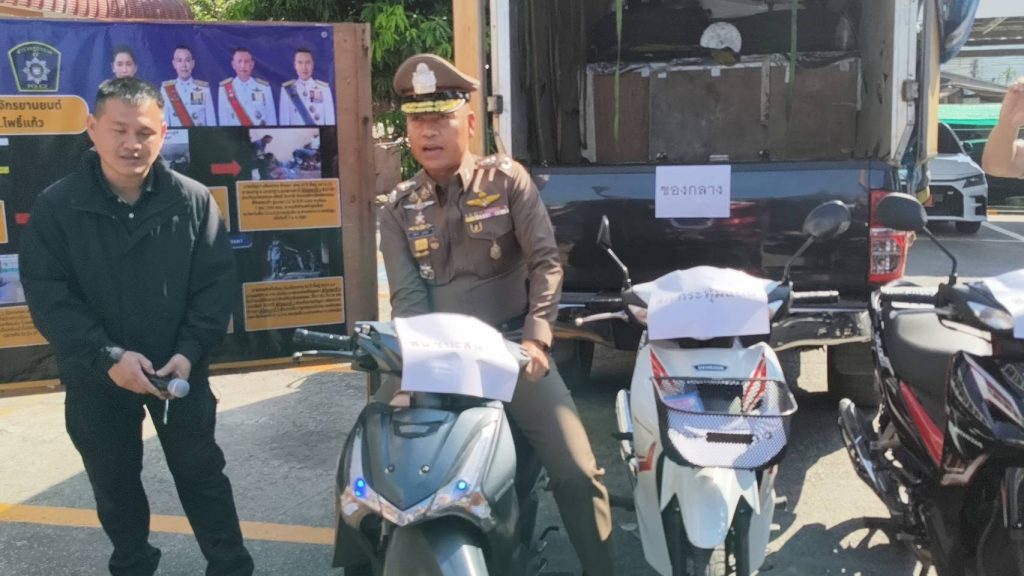 นครปฐม-ผู้การฯนำทีมแถลงรวบ แก๊งหักคอต่อสายตรง ลักจยย.ส่งขาย
