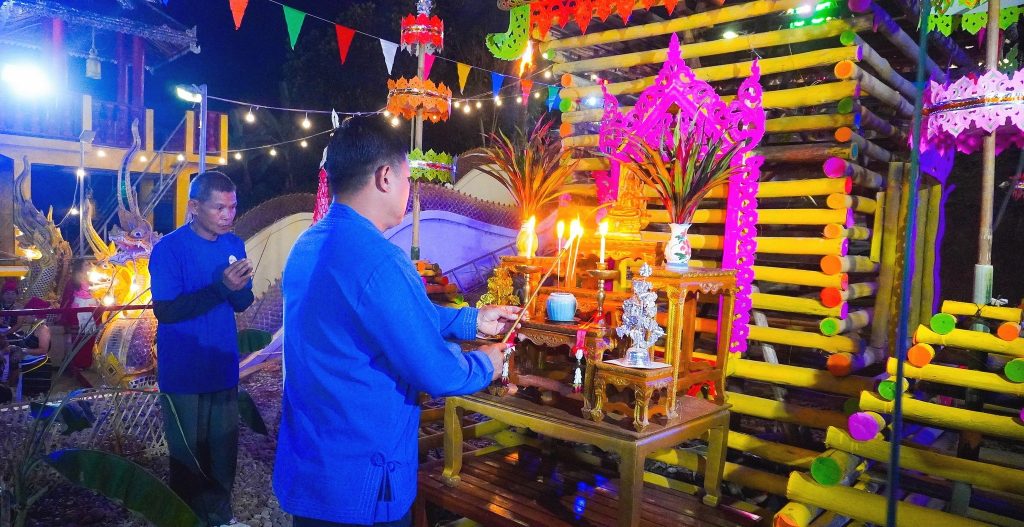เวลา 22.00 น.พิธีการจัดไฟบูชาฟืนกองโหล เพื่อถวายองค์สัมมาสัมพุทธเจ้า