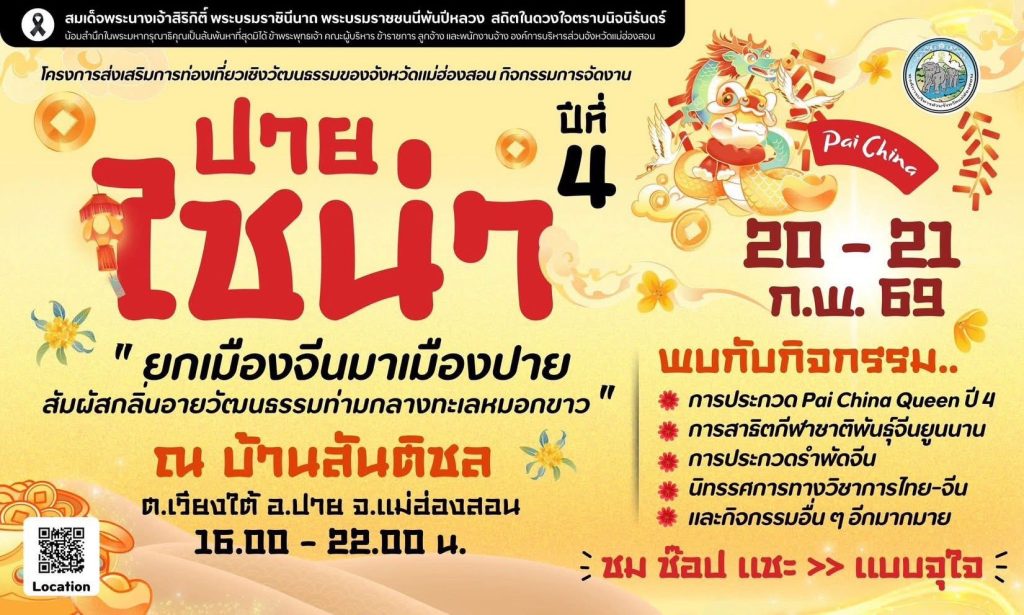 องค์การบริหารส่วนจังหวัดแม่ฮ่องสอน นำโดย นายอัครเดช วันไชยธนวงศ์ นายกองค์การบริหารส่วนจังหวัดแม่ฮ่องสอน สานต่อโครงการส่งเสริมการท่องเที่ยวเชิงวัฒนธรรม เตรียมจัดงานปายไชน่า (Pai China) ปีที่ 4 ระหว่างวันที่ 20-21 กุมภาพันธ์ 2569 นี้ ณ หมู่บ้านสันติชล อำเภอปาย จังหวัดแม่ฮ่องสอน ซึ่งเป็นชุมชนท่องเที่ยวเชิงวัฒนธรรมของชาติพันธุ์จีนยูนนาน ที่โดดเด่นและมีชื่อเสียงของจังหวัดแม่ฮ่องสอน เป็นที่นิยมของนักท่องเที่ยว