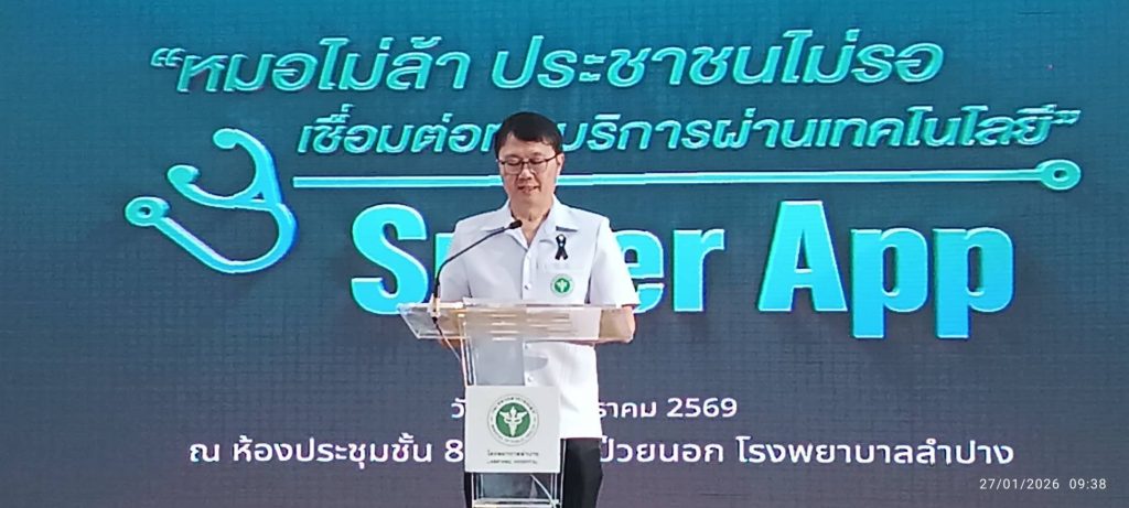 เมื่อเวลา 09.00 น.วันที่ 27 ม.ค. 2569 ที่ จ.ลำปาง ผู้สื่อข่าวรายงานว่า ณ ห้องประชุมอาคารผู้ป่วยนอก ชั้น 8 รพ.ลำปาง มีพิธีเปิดโครงการ Kick Off “หมอไม่ล้า ประชาชนไม่รอ เชื่อมต่อทุกบริการผ่านเทคโนโลยี” และ Super App ระดับเขตสุขภาพที่ 1 โดยมี นพ.ปิยะ ศิริลักษณ์ ผู้ตรวจราชการกระทรวงสาธารณสุข เขตสุขภาพที่ 1 เป็นประธานพิธีเปิดพร้อมด้วย นพ.วรินทร์เทพ เชื้อสำราญ สาธารณสุขนิเทศก์เขตสุขภาพที่ 1