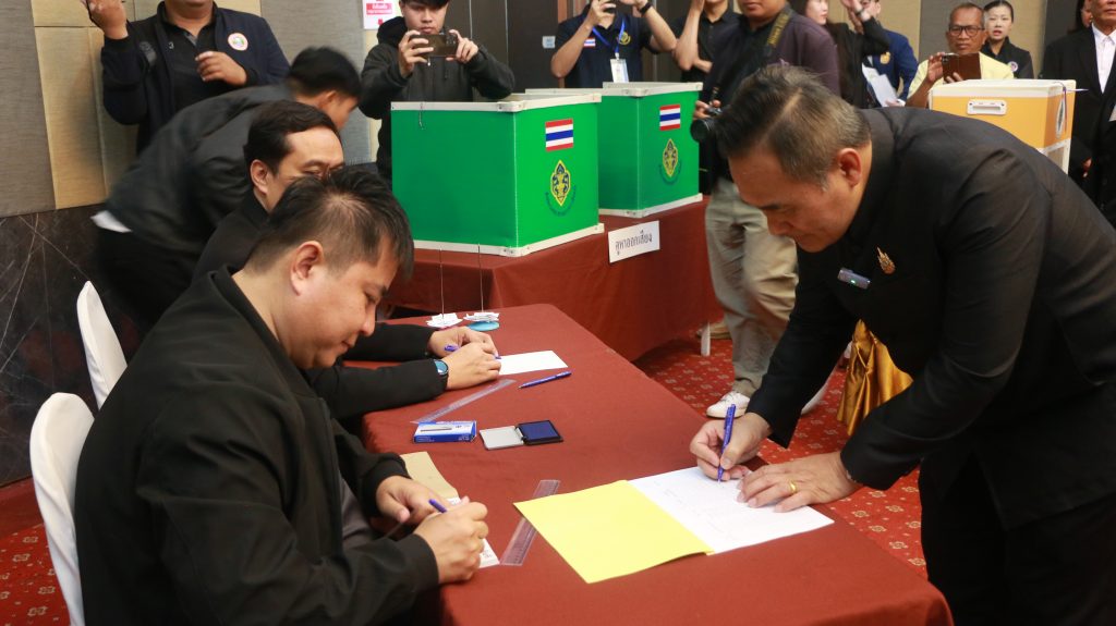 จากนั้น ผวจ.หนองคาย ได้ทดลองทำการเลือกตั้งลงคะแนนเลือกตั้ง ส.ส.แบบแบ่งเขต แบบบัญชีรายชื่อ และบัตรเลือกตั้งการออกเสียงประชามติ ณ หน่วยเลือกตั้งจำลอง ที่จัดเตรียมไว้ภายในห้องประชุม #ข่าว พ่อตู้ลภ#หนองคาย