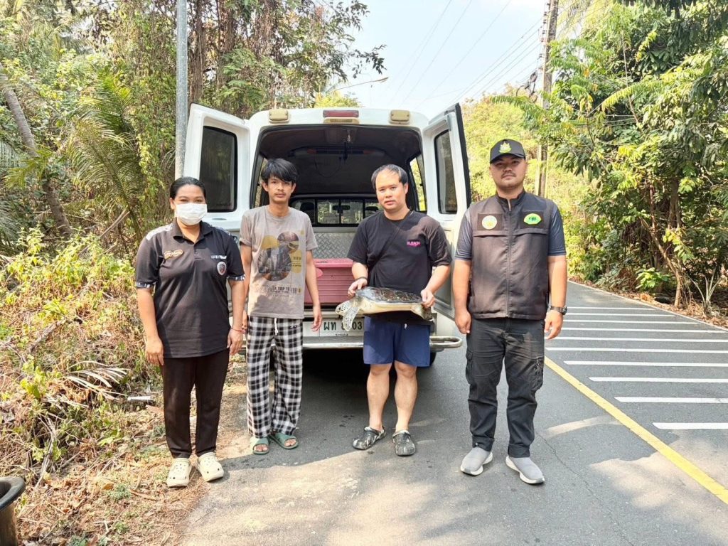 โดยคุณลุงทวีป ขณะกลับมาจากวางลอบปู เห็นเต่ากำลังว่ายน้ำอ่อนแรง จึงรีบเข้าช่วยเหลือไว้ทัน