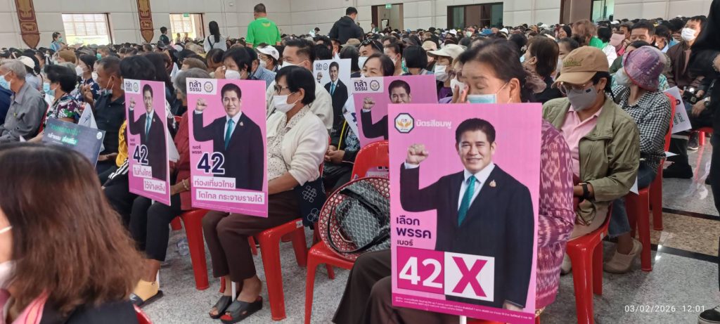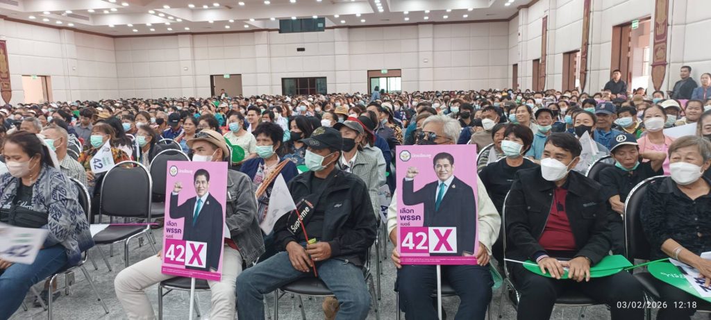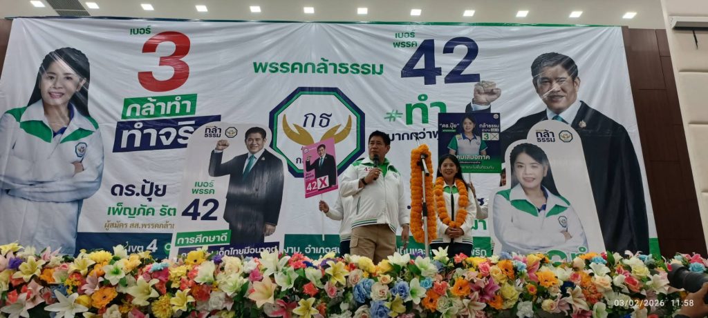 เมื่อเวลา 10.30 น. วันที่ 3 ก.พ.2569 ที่ จ.ลำปาง ผู้สื่อข่าวรายงานว่า ที่ศาลาประชุม มจร.วิทยาลัยสงฆ์นครลำปาง อ.เกาะคา ร.อ.ธรรมนัส พรหมเผ่า ประธานที่ปรึกษาพรรคกล้าธรรม และแคนดิเดตนายกรัฐมนตรี และคณะลงพื้นที่ปราศัยช่วยหาเสียง น.ส.เพ็ญภัค รัตนคำฟู (ดร.ปุ้ย อดีตนายก ทต.เกาะคา 4 สมัย) ผู้สมัคร สส.ลำปาง เขต 4 เบอร์ 3 พรรคกล้าธรรม โดยมีประชาชนชาวเกาะคาและชาวลำปางเข้าร่วมรับฟังอย่างล้นหลาม โดยก่อนหน้านั้นในช่วงเช้าเดินทางไปปราศัยที่ อ.สบปราบและช่วงเย็นวันที่ผ่านมา ที่ อ.เสริมงาม โดยมีความมั่นใจจะปักธง สส.ลำปางได้