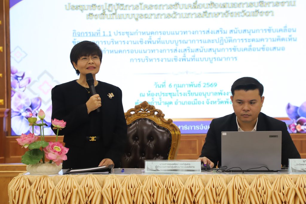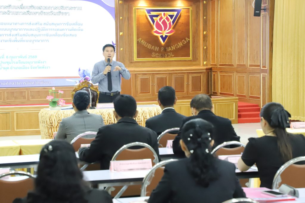 วันที่ 6 กุมภาพันธ์ 2569 สำนักงานศึกษาธิการจังหวัดพังงา จัดประชุมเชิงปฏิบัติการโครงการขับเคลื่อนข้อเสนอการบริหารงานเชิงพื้นที่แบบบูรณาการด้านการศึกษา จังหวัดพังงา ณ ห้องประชุมโรงเรียนอนุบาลพังงา อำเภอเมือง จังหวัดพังงา โดยได้รับเกียรติจากนายไพรัตน์ เพชรยวน ผู้ว่าราชการจังหวัดพังงา เป็นประธานในพิธีเปิดการประชุม