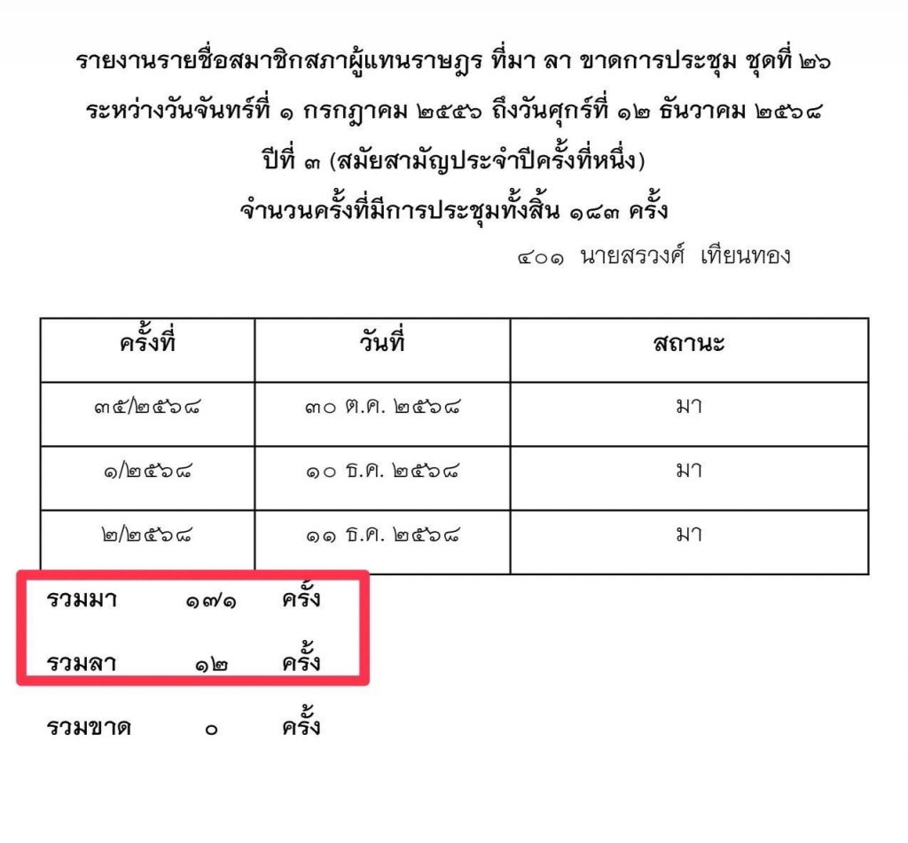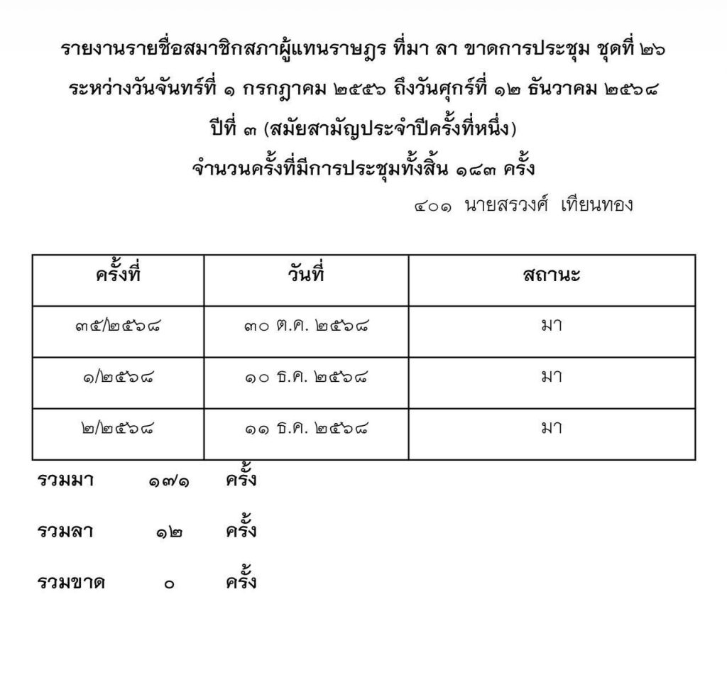 ทั้งนี้ นายสรวงศ์ ได้ชี้แจงพร้อมเอกสารยืนยันการปฏิบัติหน้าที่ในสภาว่า ตั้งแต่วันที่ 1 กรกฎาคม 2556 ถึงวันที่ 12 ธันวาคม 2568 ตนเข้าร่วมประชุมสภา 171 ครั้ง จากทั้งหมด 183 ครั้ง และลาประชุมเพียง 12 ครั้งเท่านั้น ซึ่งแตกต่างจากข้อมูลที่ถูกเผยแพร่ในสื่อออนไลน์อย่างสิ้นเชิง…..
