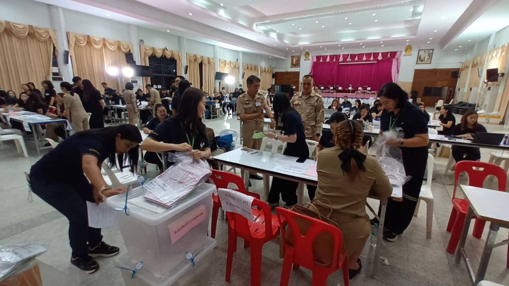 ลำปาง-กกต.ลำปาง ตรวจสอบการนำส่งผลการนับคะแนน อุปกรณ์การเลือกตั้ง จ.ลำปาง พรรคกล้าธรรม และพรรค ปชน.แบ่งคนละครึ่ง