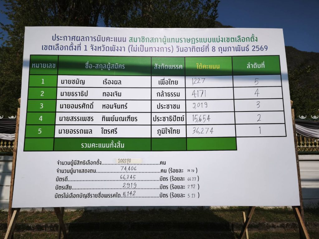 เมื่อวันที่ 9 กุมภาพันธ์ 2569 ผู้สื่อข่าวรายงานผลการนับคะแนนเลือกตั้งสมาชิกสภาผู้แทนราษฎรแบบแบ่งเขตเลือกตั้ง อย่างไม่เป็นทางการ ในเขตเลือกตั้งที่ 1 จังหวัดพังงาซึ่งประกอบด้วยพื้นที่ อำเภอเมืองพังงา อำเภอตะกั่วทุ่ง อำเภอทับปุด และอำเภอเกาะยาว เมื่อวันที่ 8 กุมภาพันธ์ 2569 ปรากฏว่า นายอรรถพล ไตรศรี ผู้สมัคร เบอร์ 5 จากพรรคภูมิใจไทย ได้รับคะแนนสูงสุด 36,274 คะแนน เขตเลือกตั้งที่ 2 ประกอบด้วย อำเภอท้ายเหมือง ตะกั่วป่า คุระบุรี และกะปง ปรากฏว่า นายฉกาจ พัฒนกิจวิบูลย์ ผู้สมัคร เบอร์ 3 จากพรรคภูมิใจไทย ได้รับคะแนนสูงสุด 26,513 คะแนน คว้าชัยชนะในการเลือกตั้งครั้งนี้ คะแนนแบบบัญชีรายชื่อ ประชาธิปัตย์นำขาดทั้ง2เขต ตามด้วยพรรคประชาชน และพรรคภูมิใจไทย