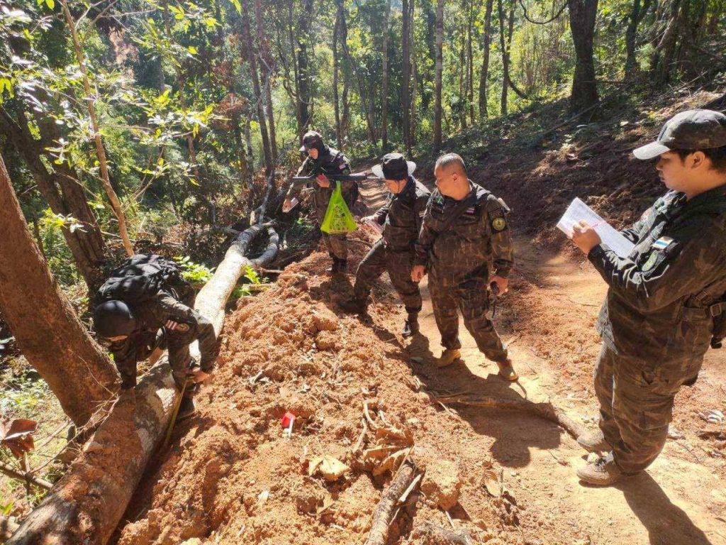 จากการลงพื้นที่สืบทราบข้อมูลเบื้องต้นจากชาวบ้านและผู้ใหญ่บ้านหมู่บ้านห้วยกองเป๊าะ ได้ข้อมูลว่าพบว่า มีการทำถนนดังกล่าวเริ่มดำเนินการมาตั้งแต่ช่วงวันที่ 20 กันยายน 2568 และมีการพูดถึงประเด็นนี้ในการประชุมผู้ใหญ่บ้านเมื่อวันที่ 24 กันยายน 2568 โดยข้อมูลในทางลับปรากฏพฤติการณ์ที่น่าเชื่อว่า มีผู้ใหญ่บ้านในพื้นที่ใกล้เคียงกับหมู่บ้านห้วยกองเป๊าะ เป็นเจ้าของเครื่องจักร ทั้งรถแบคโฮและรถไถฟาร์ม รวมถึงเป็นผู้รับเหมาขุดเจาะถนนเส้นนี้เพื่อใช้สำหรับขนส่งสินค้าเกษตรไม่ทราบประเภทจากประเทศเมียนมาเข้ามายังประเทศไทย