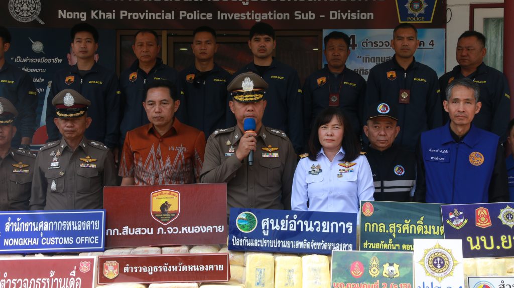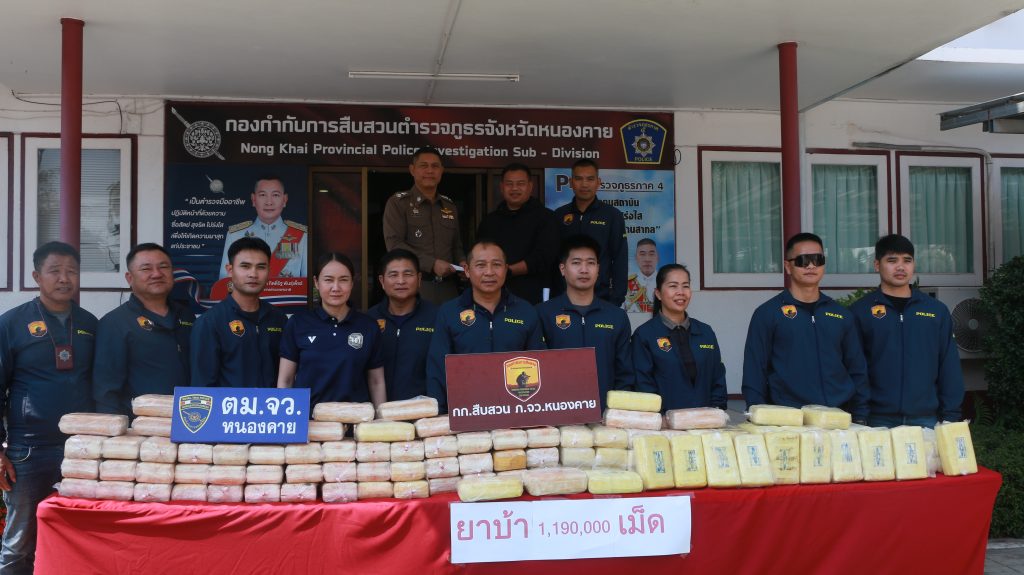 วันที่ 17 ก.พ.69 เวลา 11.00 น ที่ กองกำกับการสืบสวน ตำรวจภูธรจังหวัดหนองคาย นายไพฑูรย์ มหาชื่นใจ รองผู้ว่าราชการจังหวัดหนองคาย,พล.ต.ต.อัทธชนม์ ช่วงงาม ผบก.ภ.จว.หนองคาย,นายจักรพงศ์ พันธุ์เพ็ง นายอำเภอเมืองหนองคาย ,รอง กอ.รมน.นค.(ท.),นางสาววรรณา ผู้อุตส่าห์ นายด่านศุลกากรหนองคาย,พ.ต.อ.จิรวิทย์ ปานยิ้ม ผกก.สภ.หนองคาย,ตม.หนองคาย,นรข.หนองคาย,บก.ควบคุมที่ 2 กกล.สุรศักดิ์มนตรี,พร้อมเจ้าหน้าที่ความมั่นคงจำนวนหนึ่ง แถลงข่าวการจับกุม นายอนนท์ (ปิดสกุล) อายุ 33 ปี,นายอริย (ปิดสกุล) อายุ 31 ปี ชาวจังหวัดอุดรธานี พร้อมยาบ้า 1,190,000 เม็ด บรรทุกมาในรถยนต์กระบะเชฟโลเลต ที่บริเวณบริเวณถนนหมู่บ้านจอมแจ้ง – บ้านดงเวร ต.สีกาย อ.เมือง จ.หนองคาย