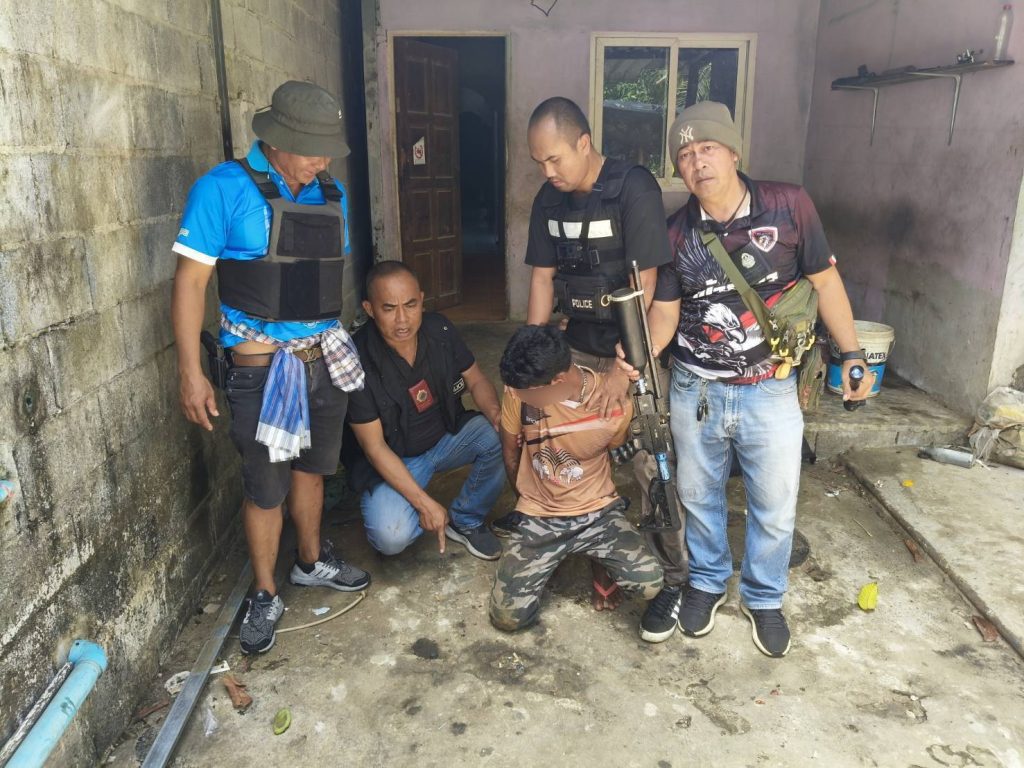 พังงา-ชุดสืบสวนสภ.ตะกั่วทุ่งพร้อมผู้ใหญ่บ้าน บุกจับหนุ่มกะไหลหนีหมายจับ พร้อมอาวุธปืน