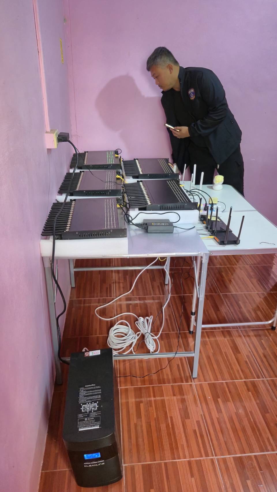 การเข้าตรวจค้นครั้งนี้ มี นางฉวี มูลศรี อายุ 58 ปี แสดงตัวเป็นเจ้าของสถานที่ และนำเจ้าหน้าที่เข้าทำการตรวจสอบ ผลการตรวจสอบเบื้องต้น พบอุปกรณ์ซิมบ็อกซ์ (SIM Box) จำนวน 8 เครื่อง ซุกซ่อนอยู่ภายในห้องเช่า 2 ห้อง พร้อมอุปกรณ์เราเตอร์ WiFi และอุปกรณ์คอมพิวเตอร์ที่ใช้ควบคุมการทำงาน