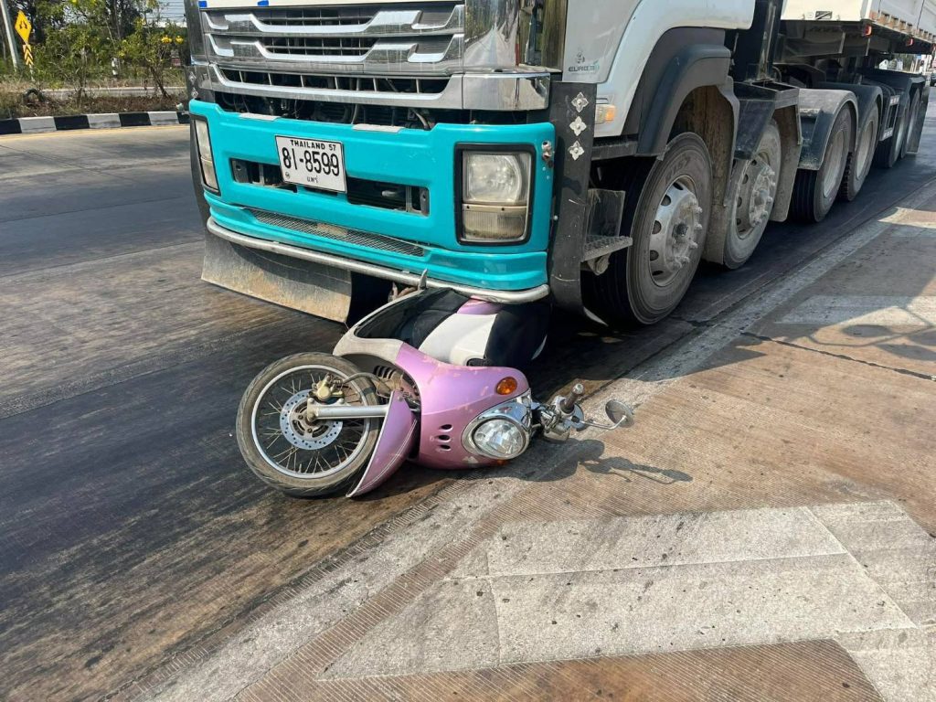 ลำปาง-รถบรรทุกพ่วง เฉี่ยวชนกับรถ จยย.กลางสี่แยก ขนส่งลำปางบาดเจ็บ 1 ดับ 1