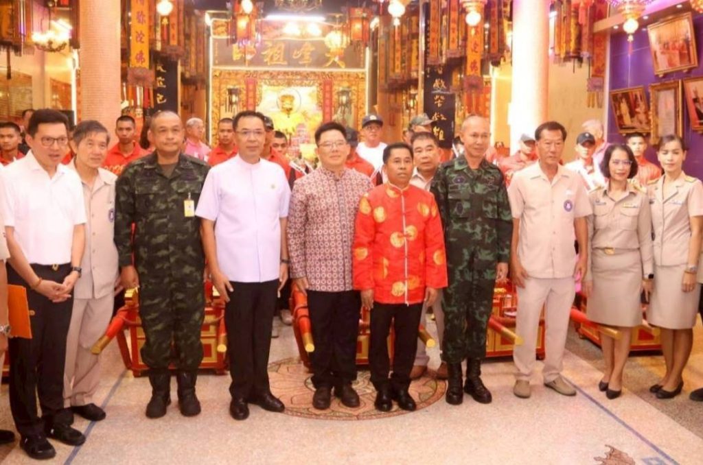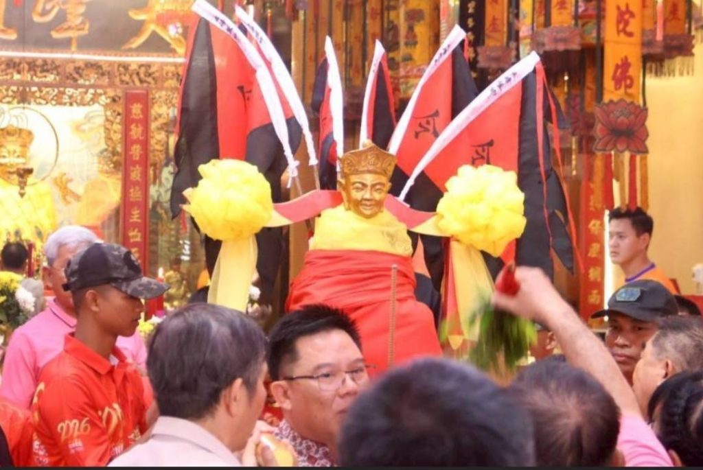 ภายในพิธี ผู้ร่วมงานได้ร่วมสักการะศาลเจ้า ยกกระถางธูปทองเหลือง และร่วมอัญเชิญเกี้ยวหามพระขึ้นสู่ขบวนแห่ ก่อนเปิดศาลเจ้าอัญเชิญองค์พระจำลองออกแห่รอบเมือง ขบวนแห่นำโดยวงมโหรีจีน คณะโล่วโก้ว มูลนิธิแม่กอเหนี่ยวยะลา พร้อมคณะสิงโต–มังกรทองจากกรุงเทพมหานครและจังหวัดยะลา สร้างบรรยากาศแห่งความศรัทธาและความคึกคักตลอดเส้นทาง โดยศาลเจ้าได้ประกอบพิธีปิดประตูเพื่อเสี่ยงทายจำนวน 3 ครั้ง ตามธรรมเนียมปฏิบัติ ก่อนที่ พลตรี กรกฎ ภู่โชติ รองแม่ทัพภาคที่ 4 จะร่วมกับคณะกรรมการศาลเจ้าหามเกี้ยวอัญเชิญองค์พระออกจากศาลเจ้า ท่ามกลางประชาชนที่ร่วมรอรับและสักการะเป็นจำนวนมาก