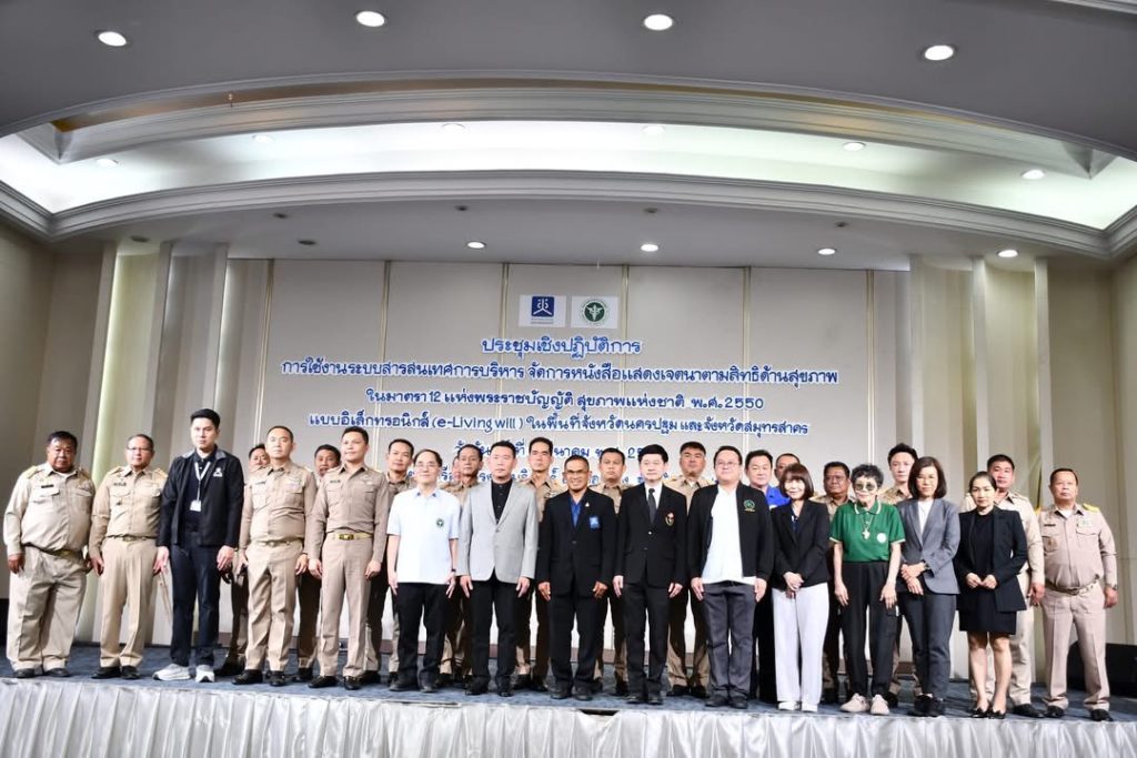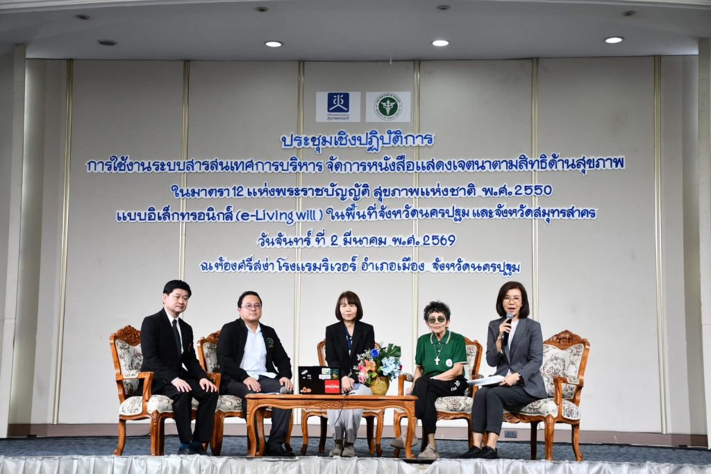 วันที่ 2 มีนาคม 2569 เวลา 09.00 น. สำนักงานสุขภาพแห่งชาติ (สช.) จัดการประชุม การจัดทำหนังสือแสดงเจตนาตามสิทธิ ด้านสุขภาพแบบอิเล็กทรอนิกส์ (e-Living will ) โดยเชิญ นพ.สุรชัย โชคครรชิตไชย ผู้อำนวยการโรงพยาบาลนครปฐม เข้าร่วมบรรยายและเสวนาในประเด็น “รู้สิทธิ์ คืนศักดิ์ศรี เลือกวาระสุดท้ายด้วยตนเอง” ณ ห้องประชุมศรีสง่า โรงแรมริเวอร์ จังหวัดนครปฐม